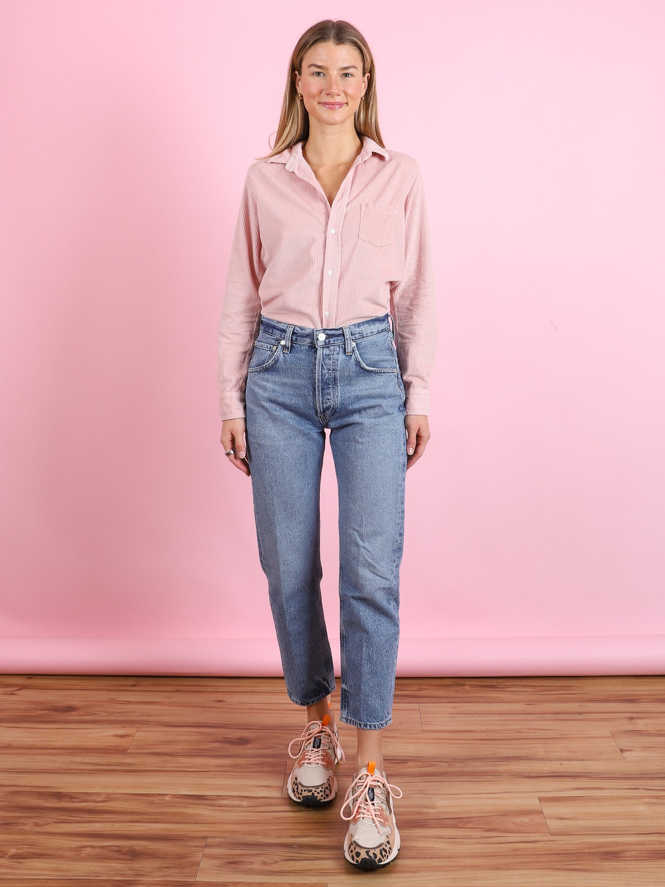 Model is 5'7," 25" waist, 34" hips - wearing a size XS. Classic "Barry fit" slim fit.  Tailored Fit, smallest of the Frank & Eileen Styles.  If in between sizes, we recommend sizing up!