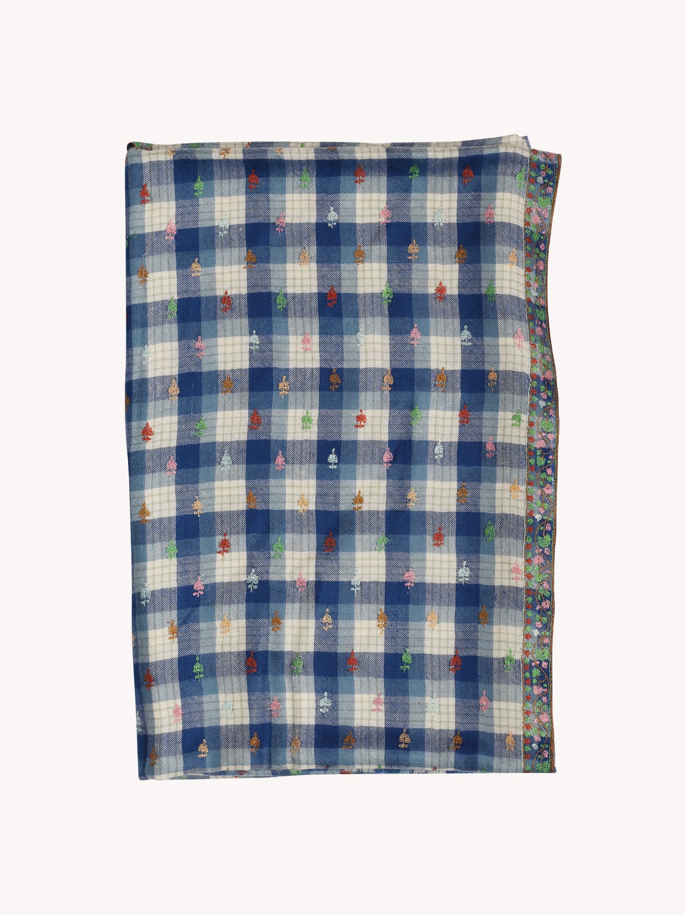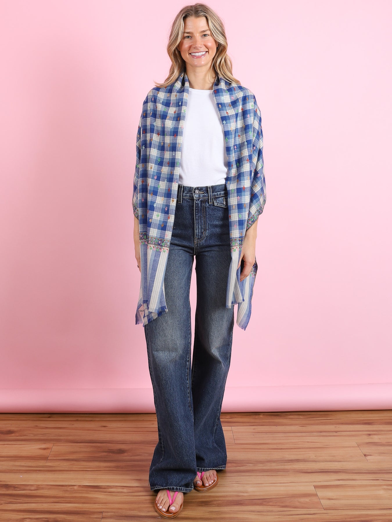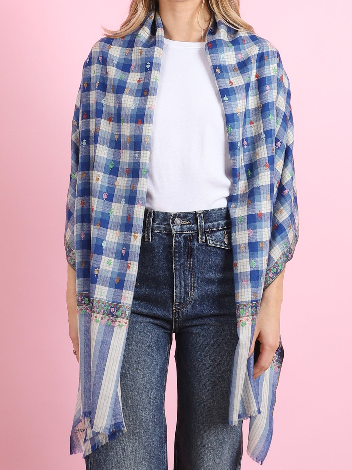 Blue & Cream Check Embroidered Yaser Shawl - CabanaCanary
