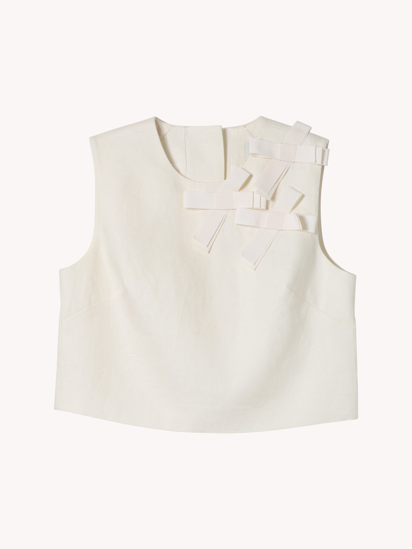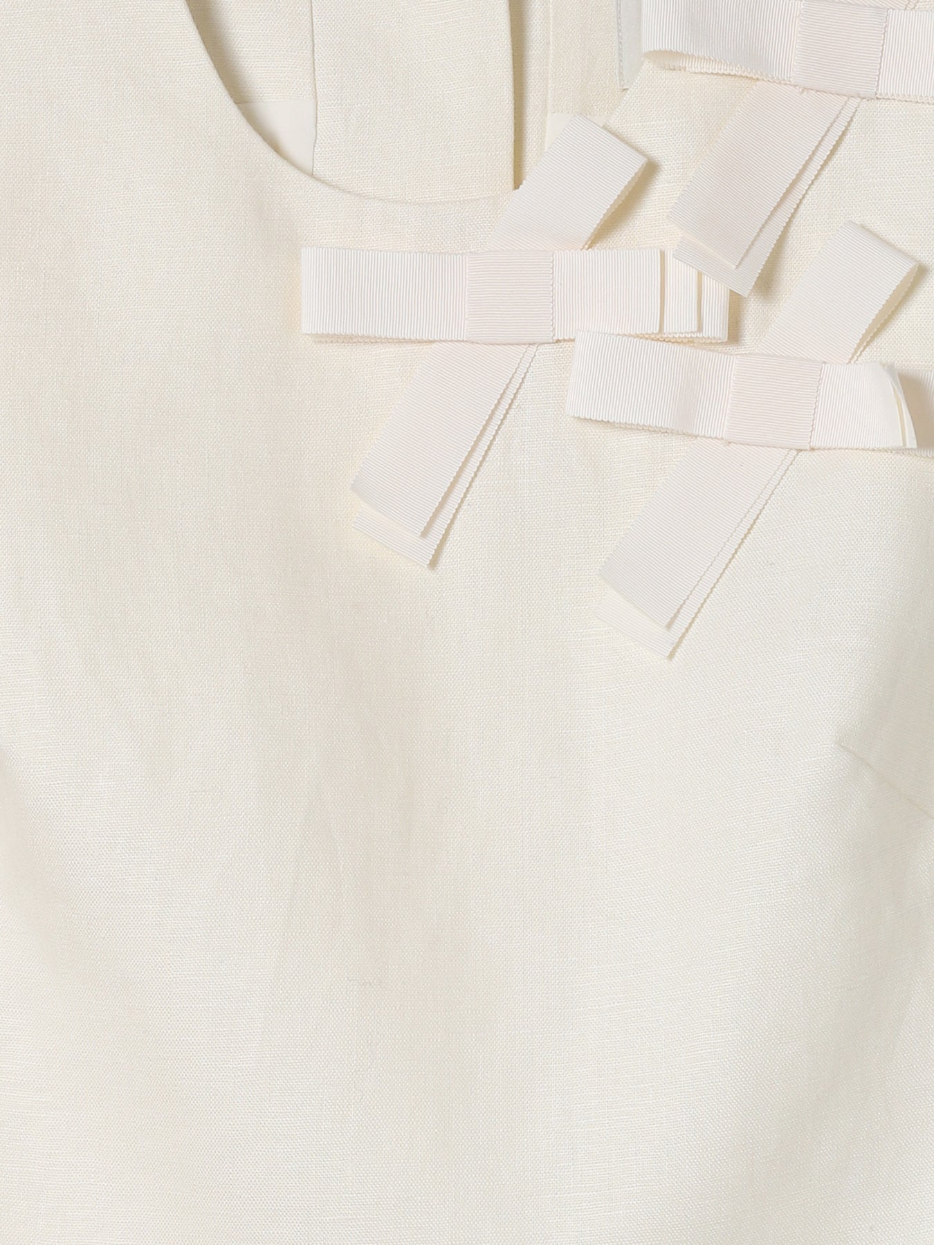 The Bow Detail Shell is a cropped heavyweight linen top with a crew neckline and self-covered back buttons. It is fully lined and finished with hand-folded grosgrain bows at the chest. This piece offers a structured yet feminine silhouette that pairs perfectly with tailored separates.