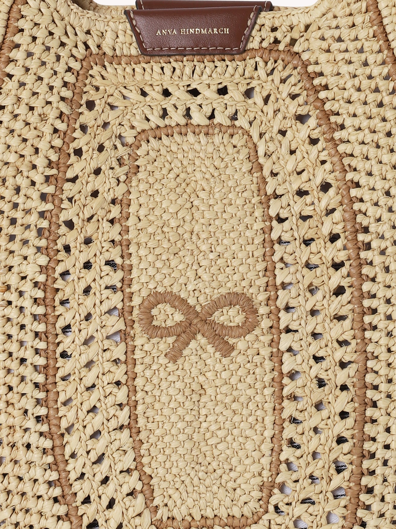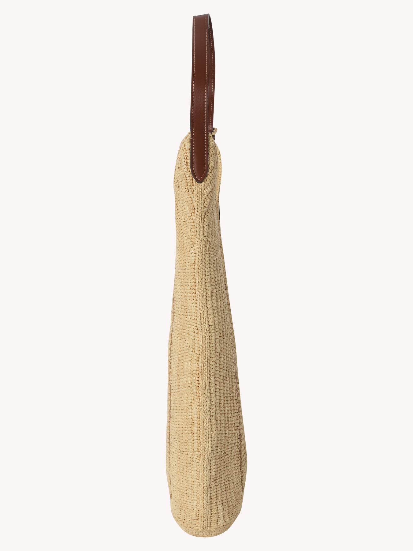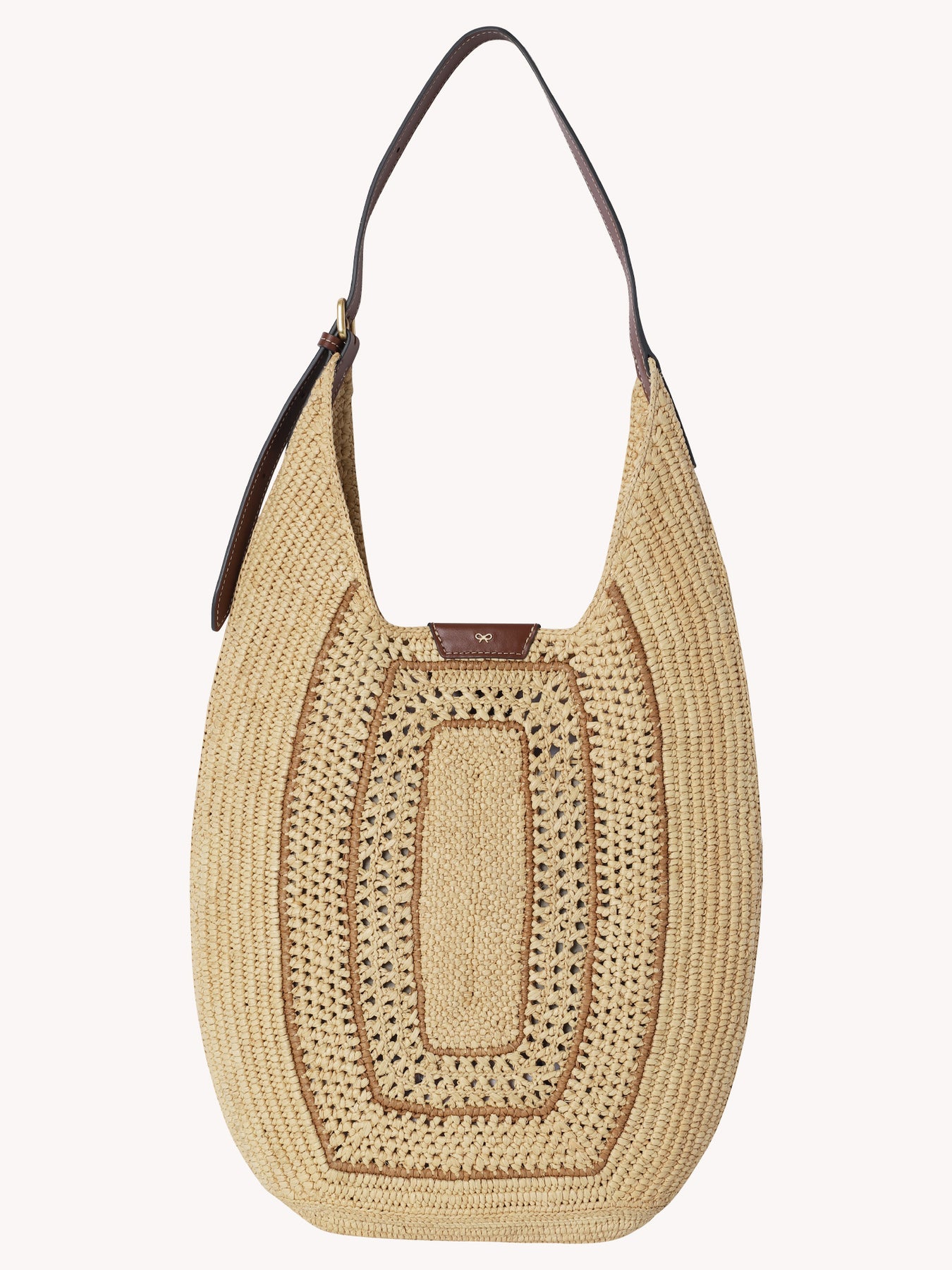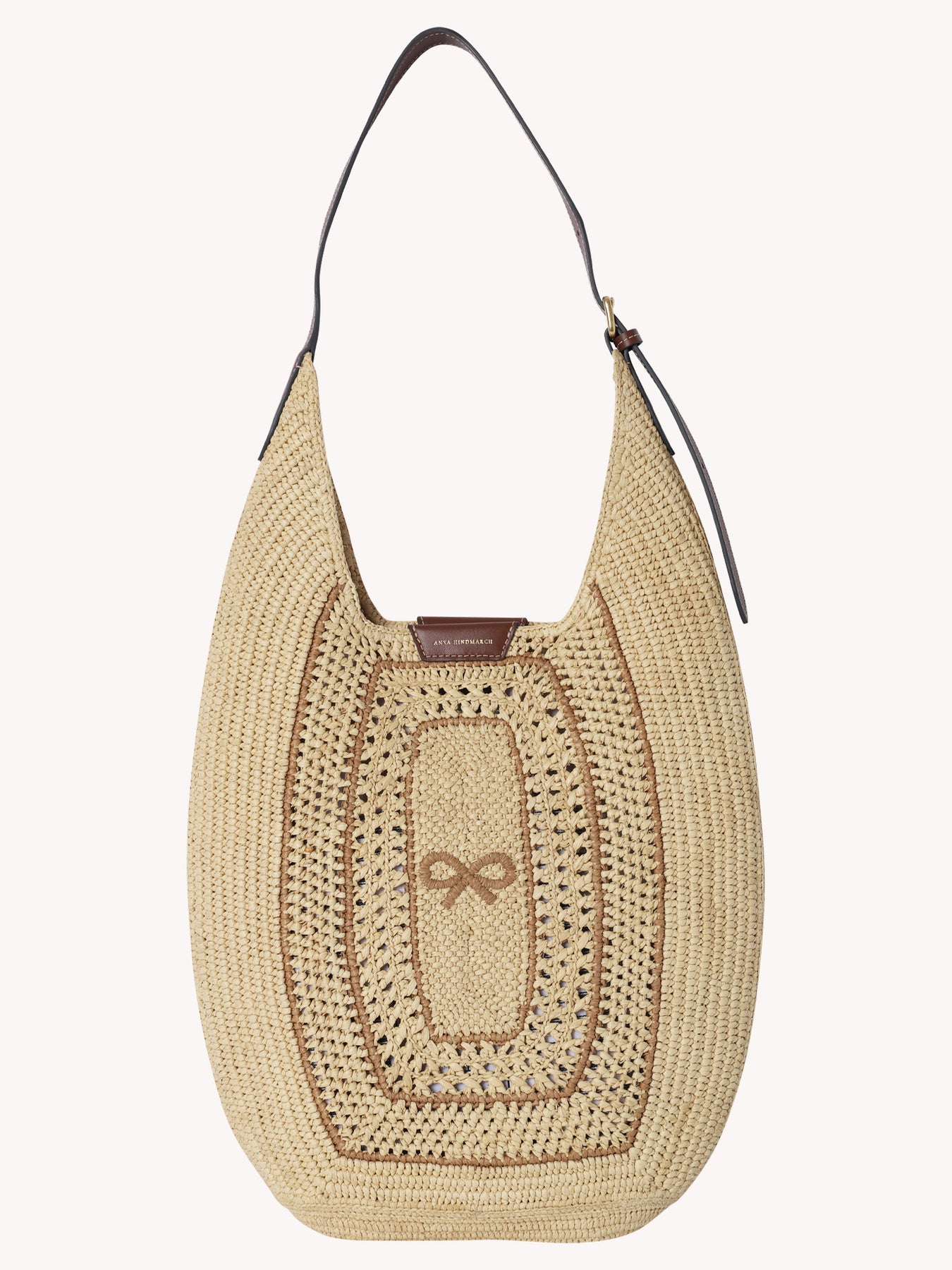 A chic take on the classic basket bag, this hobo style is woven from natural raffia and detailed with a tonal bow insignia. It has contrast-stitched, brown leather trims, including an adjustable shoulder strap, magnetic closure, and a whipstitched interior slip pocket for essential cards.