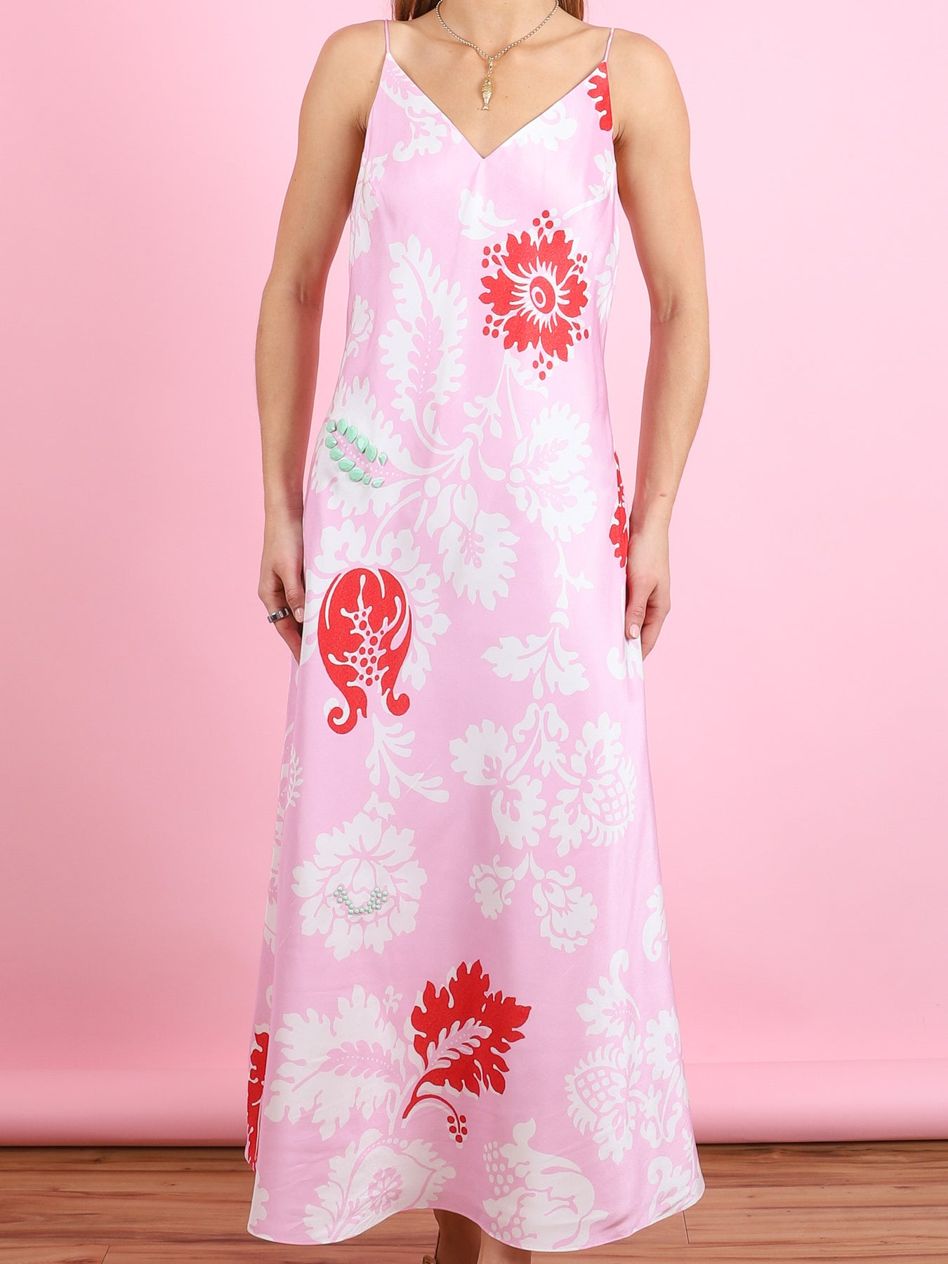 The Cabana Floral Slip Dress is cut on the bias from silk dupion for fluid drape. A V-neckline, rouleau straps and mint resin stone accents refine the silhouette, while the Cabana print of oversized cream florals with jewel-like motifs lends depth and couture-inspired elegance.
