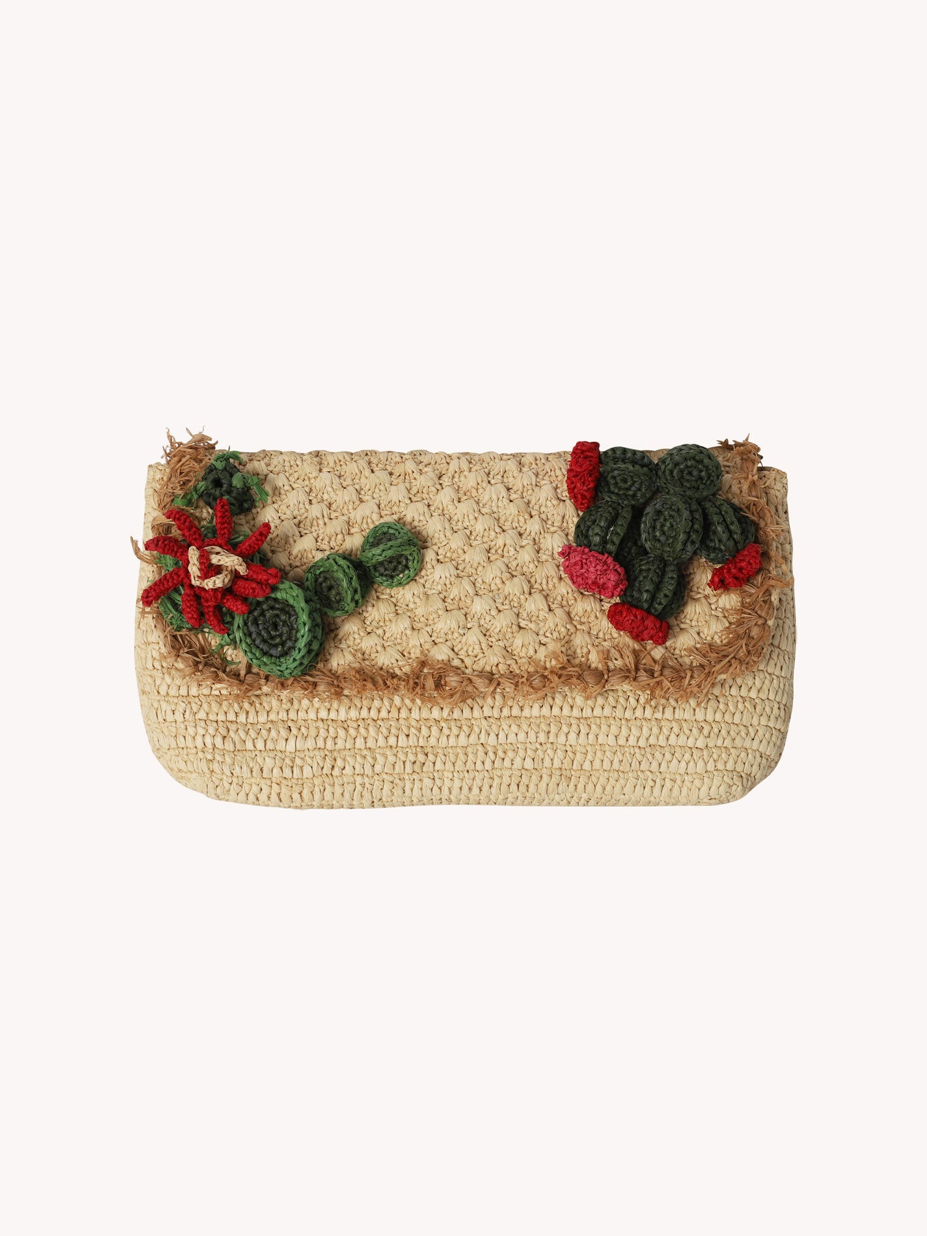 Add color and personality to your summer event outfit with the Clutch Cactus in Natural Raffia. Intricately hand woven, using a series of artisan techniques, this classic clutch silhouette is elevated via miniature hand appliqued cacti and cactus flowers.