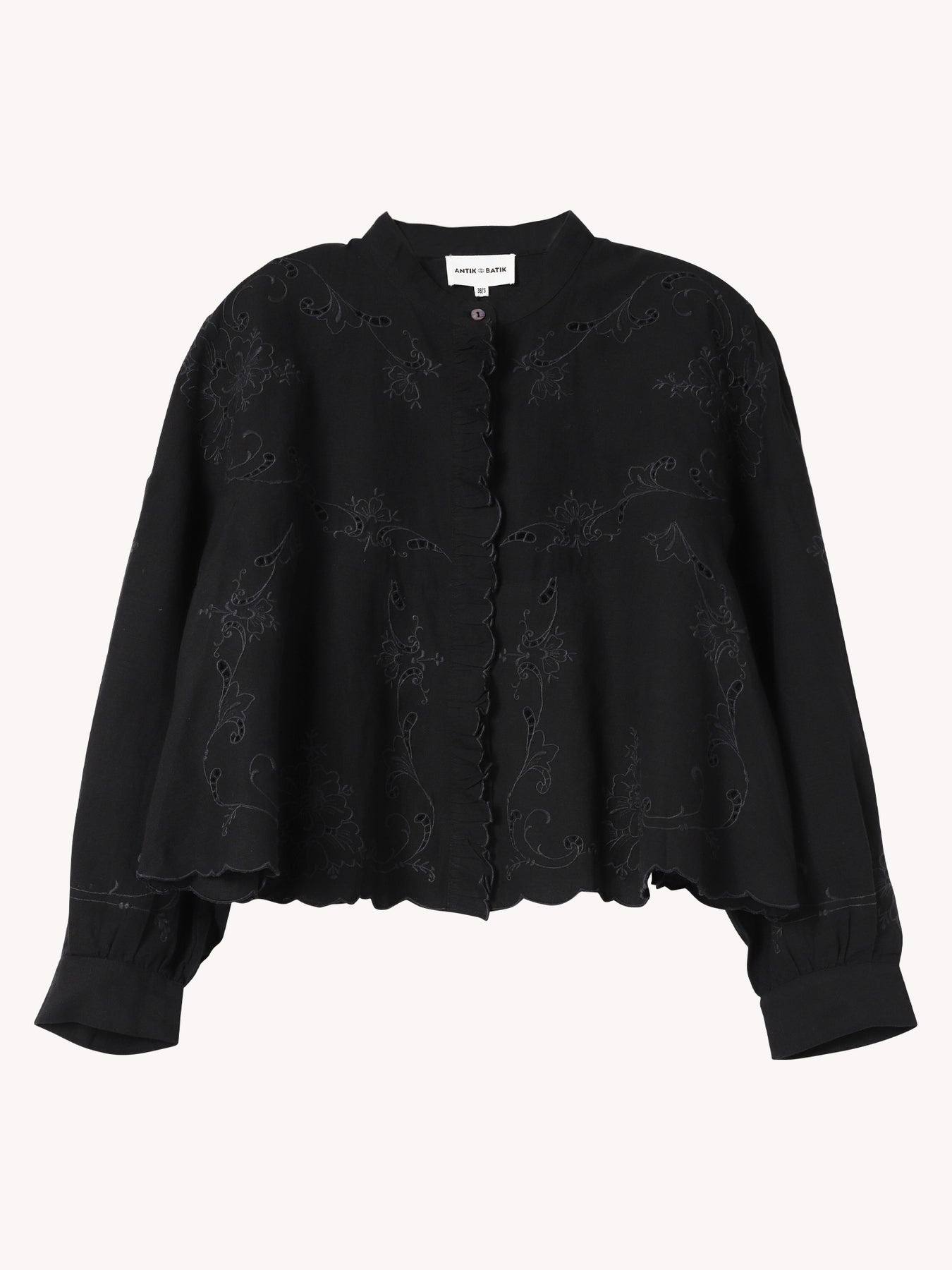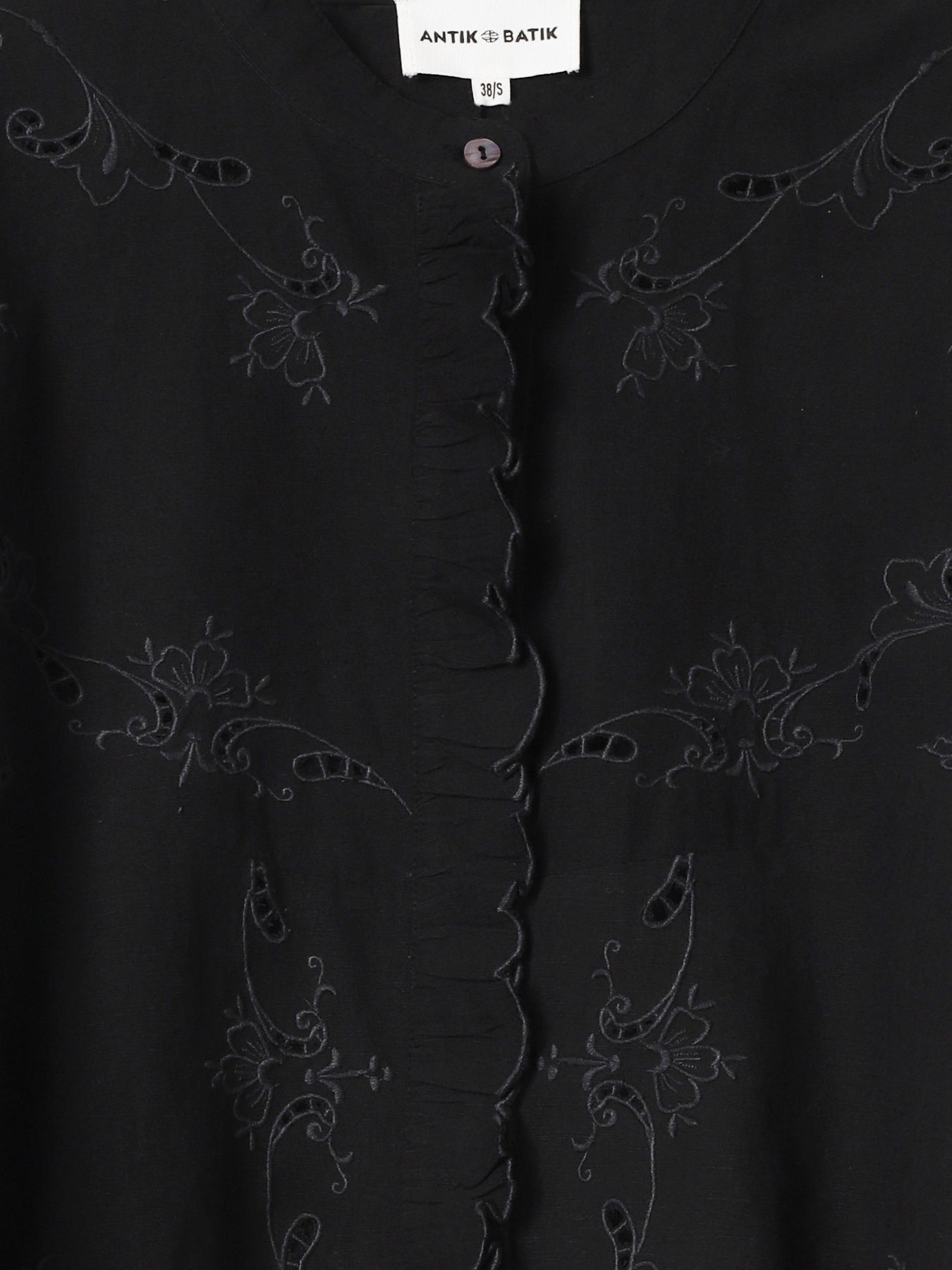 Cotton denim and linen blouse. Fully hand-embroidered blouse. Wavy cut. Buttoned mandarin collar.