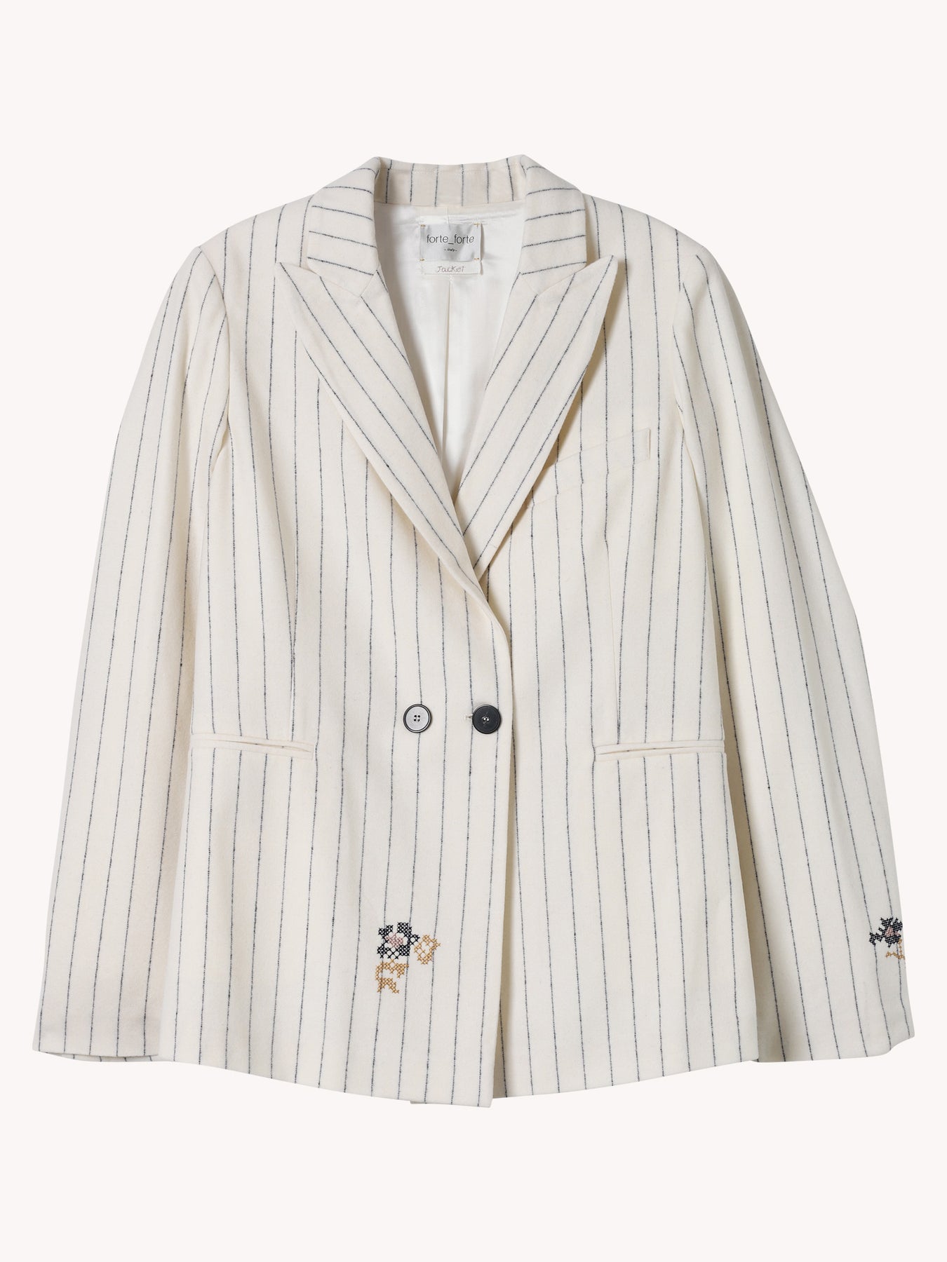The retro appeal of a pinstripe takes on a fresh romantic guise. This new double–breasted jacket in a pinstriped fabric is slightly longer at the sides and has a lined interior. The “en fleur” embroidered detail on the sleeve, hemline and garment rear channels the eclectic feminine charm that is so typical of forte_forte creations.