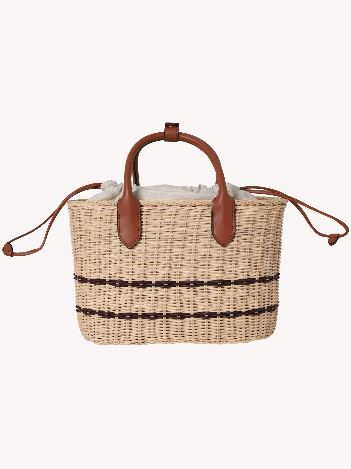 The Gable Small Tote is handcrafted from natural wicker with leather trims and helm green striped canvas. Designed with a drawstring pouch and leather top handle, this structured silhouette is ideal for daytime outings. Each tote is individually woven over four hours for a refined finish.