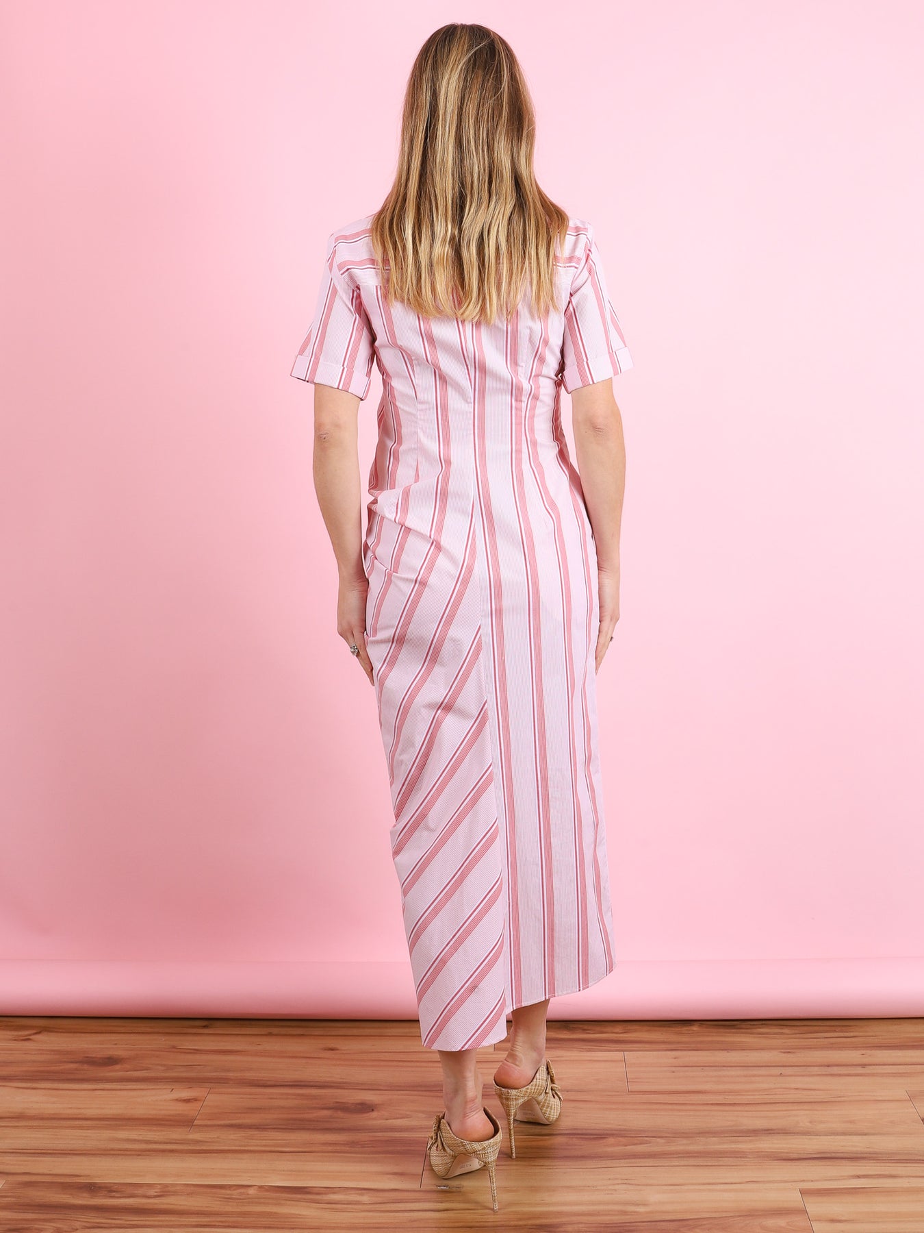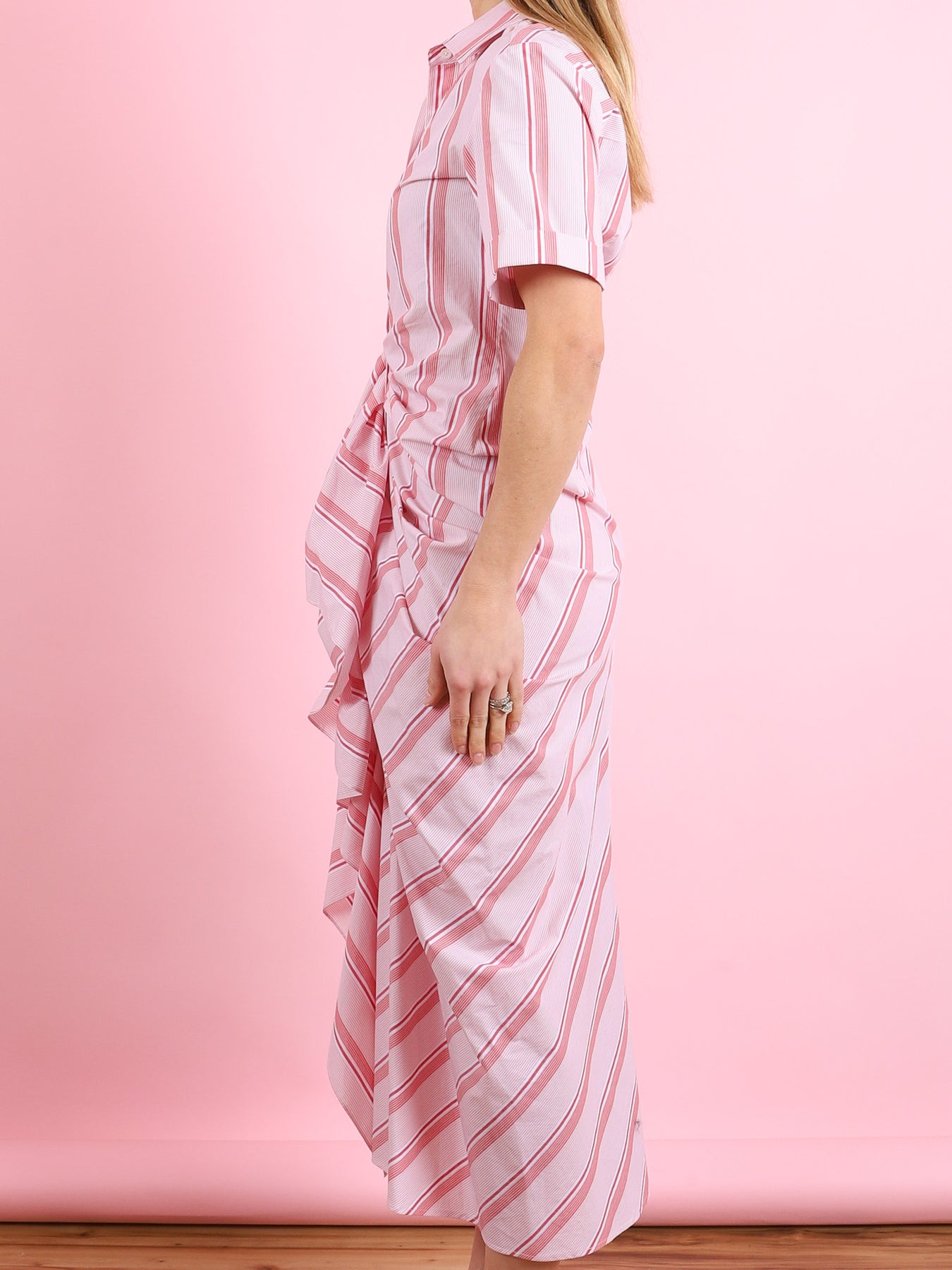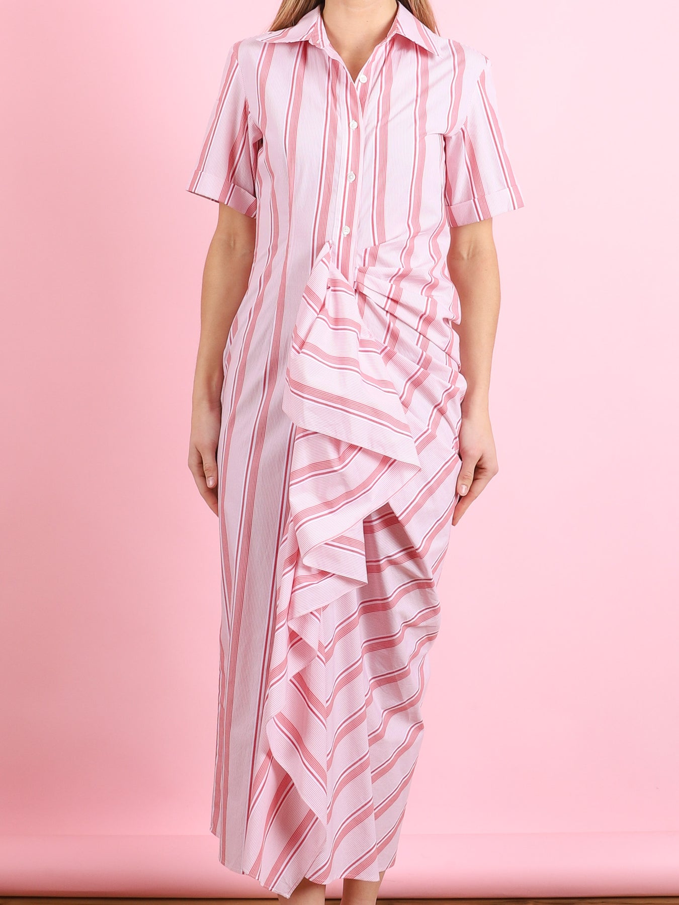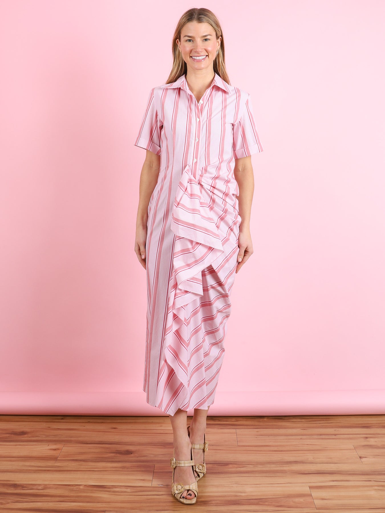 Gathered Ruffle Shirt Dress in Red Stripe