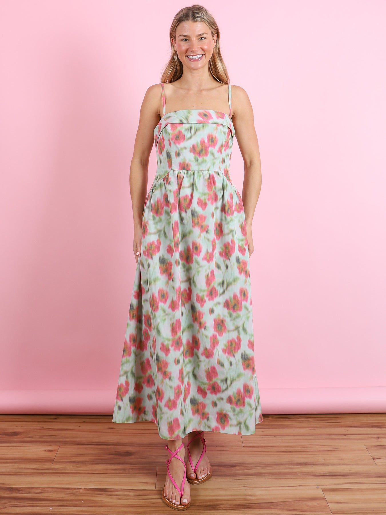 A standout style of the season in a fresh floral printed taffeta, the Gigi Dress is an elevated silhouette with a sophisticated ease. Featuring a folded neckline for a clean square neck style and a subtle cinched waist, Gigi is a flattering midi with the perfect amount of structure. Pair the Gigi Dress with a heel for a soirée ready look.