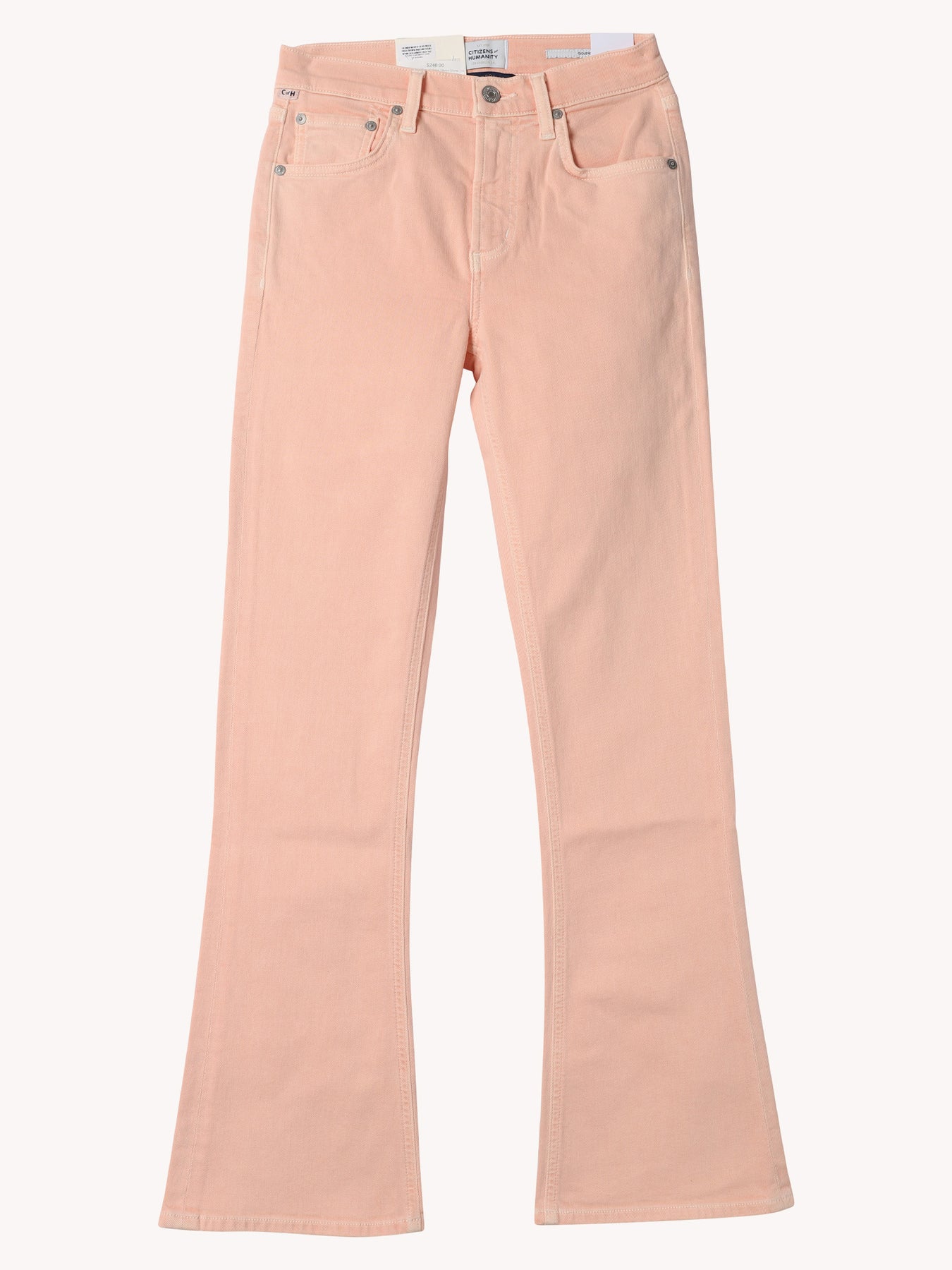 The Goldie offers a refined interpretation of ’70s-inspired denim. Designed with a mid rise and subtle kick-flare hem, the silhouette creates a long, balanced line that feels both timeless and modern. Crafted from Signature soft stretch denim in the Melon Creme wash—a light orangey pink—it’s designed to hold its shape while maintaining a smooth, comfortable feel. The perfect balance of ease and sophistication for elevated everyday dressing.