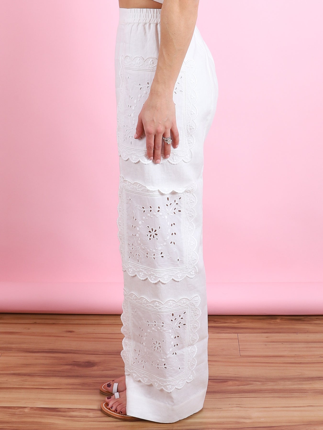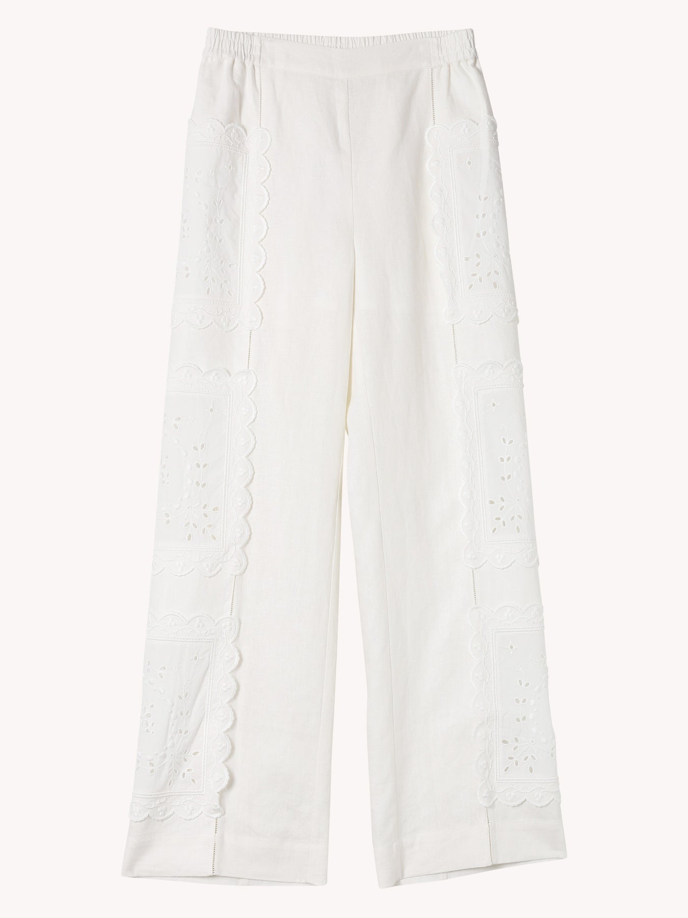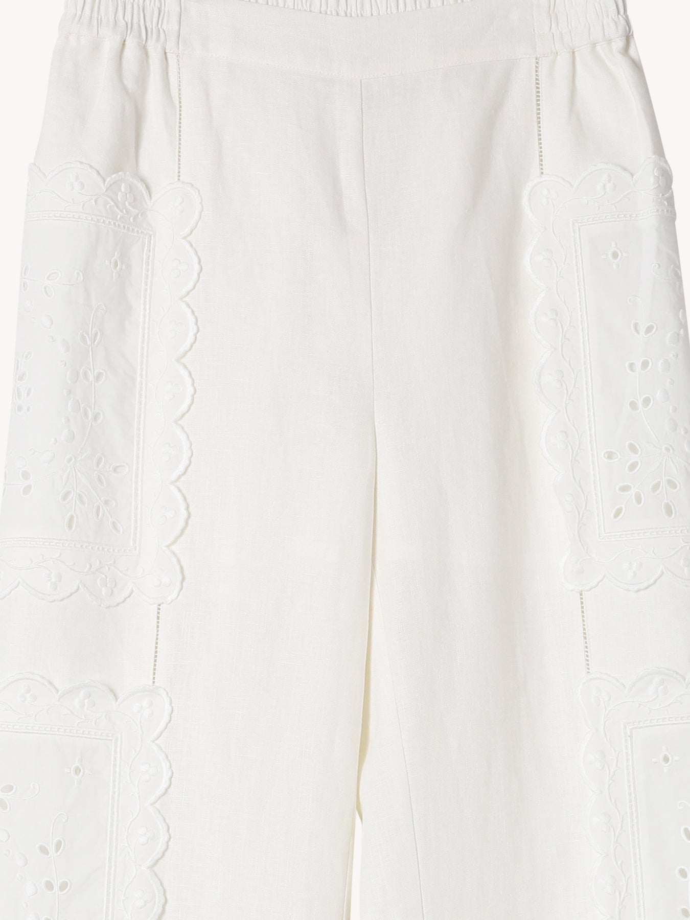 The Handkerchief PJ Pant is crafted from mid-weight linen with ladder trim at the front legs and embroidered handkerchief doilies at the sides. Designed with a tailored front waistband and elastic back, it offers a relaxed full-length silhouette with side pockets, balancing elegance and ease.