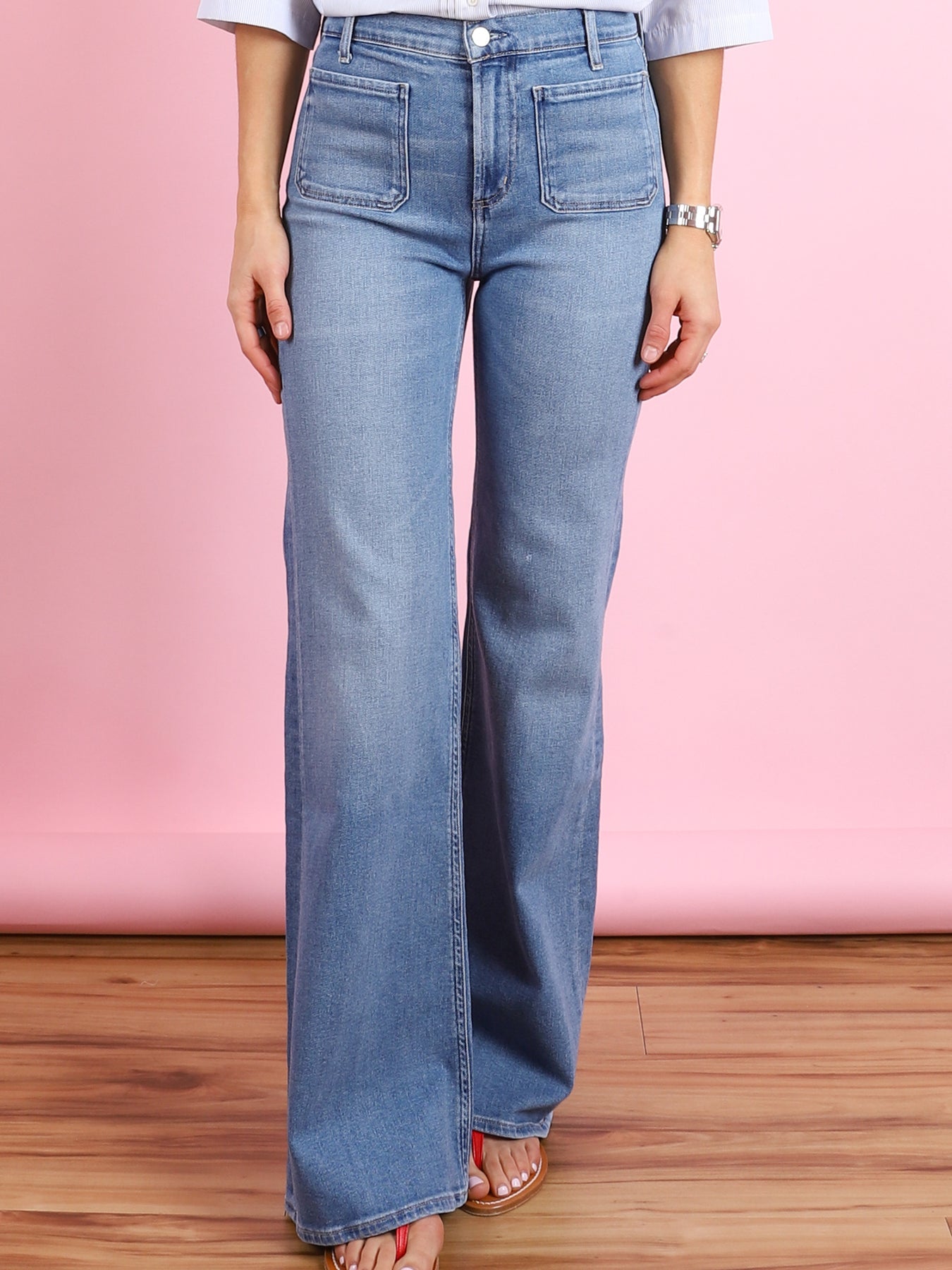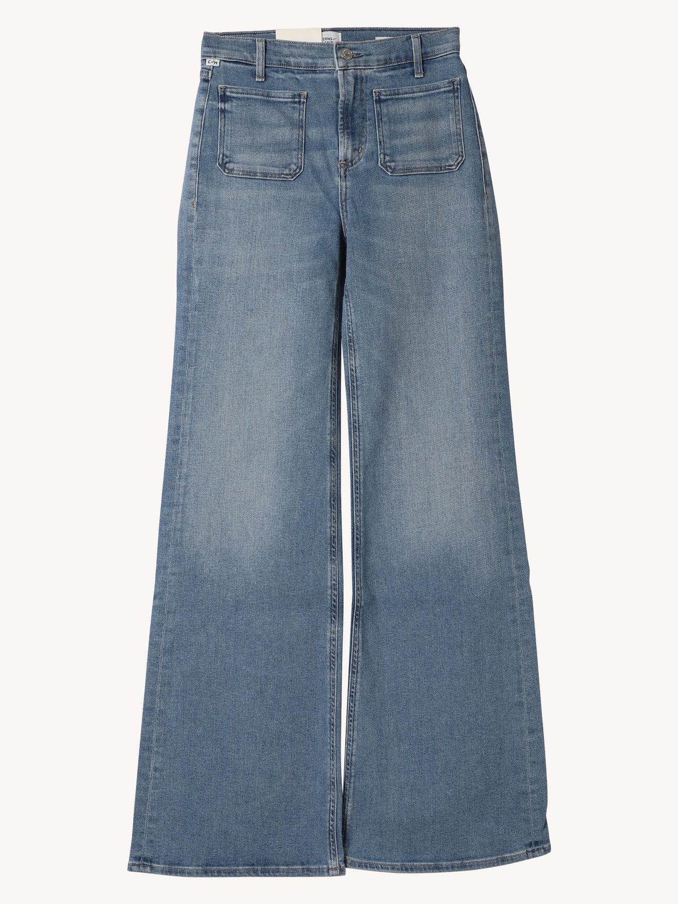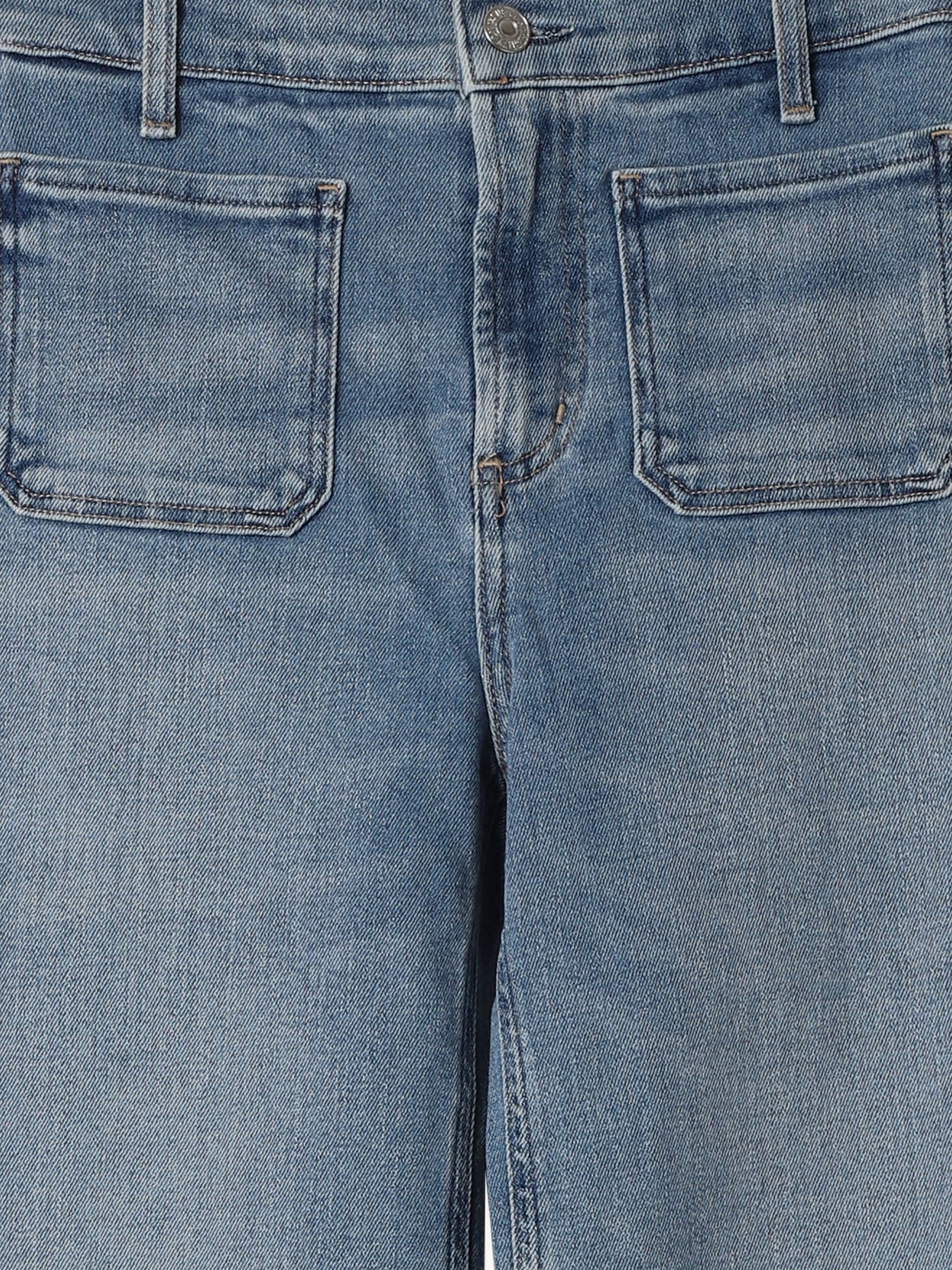 A high-rise flare designed to contour the waist with a clean, balanced silhouette. Finished with front patch pockets, it brings a subtle utilitarian touch to a timeless shape. Crafted from medium indigo comfort stretch archive denim, it offers a super-soft hand with all-day wearability. Effortlessly versatile, it pairs seamlessly with crisp shirting or fitted knits for a polished, modern look