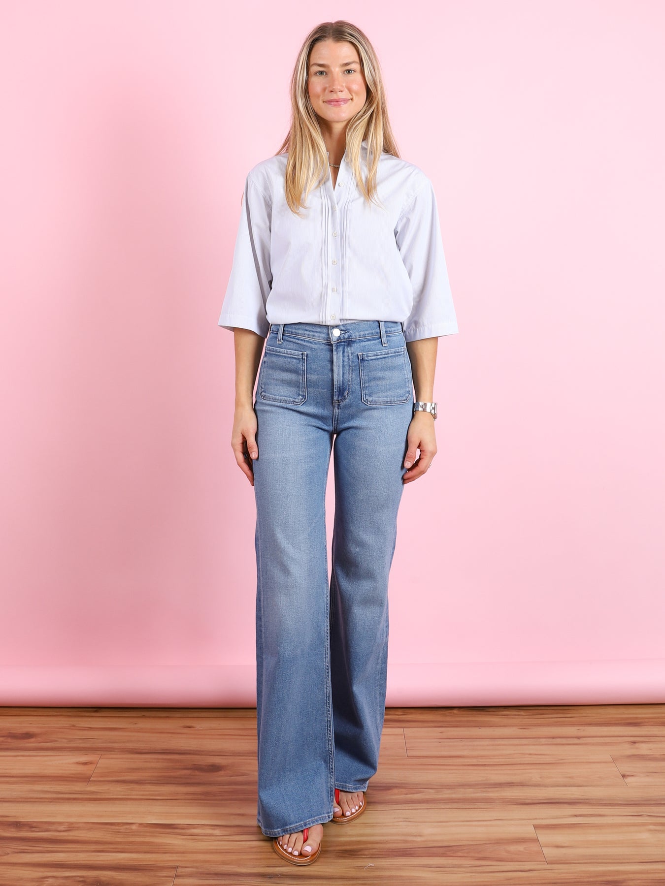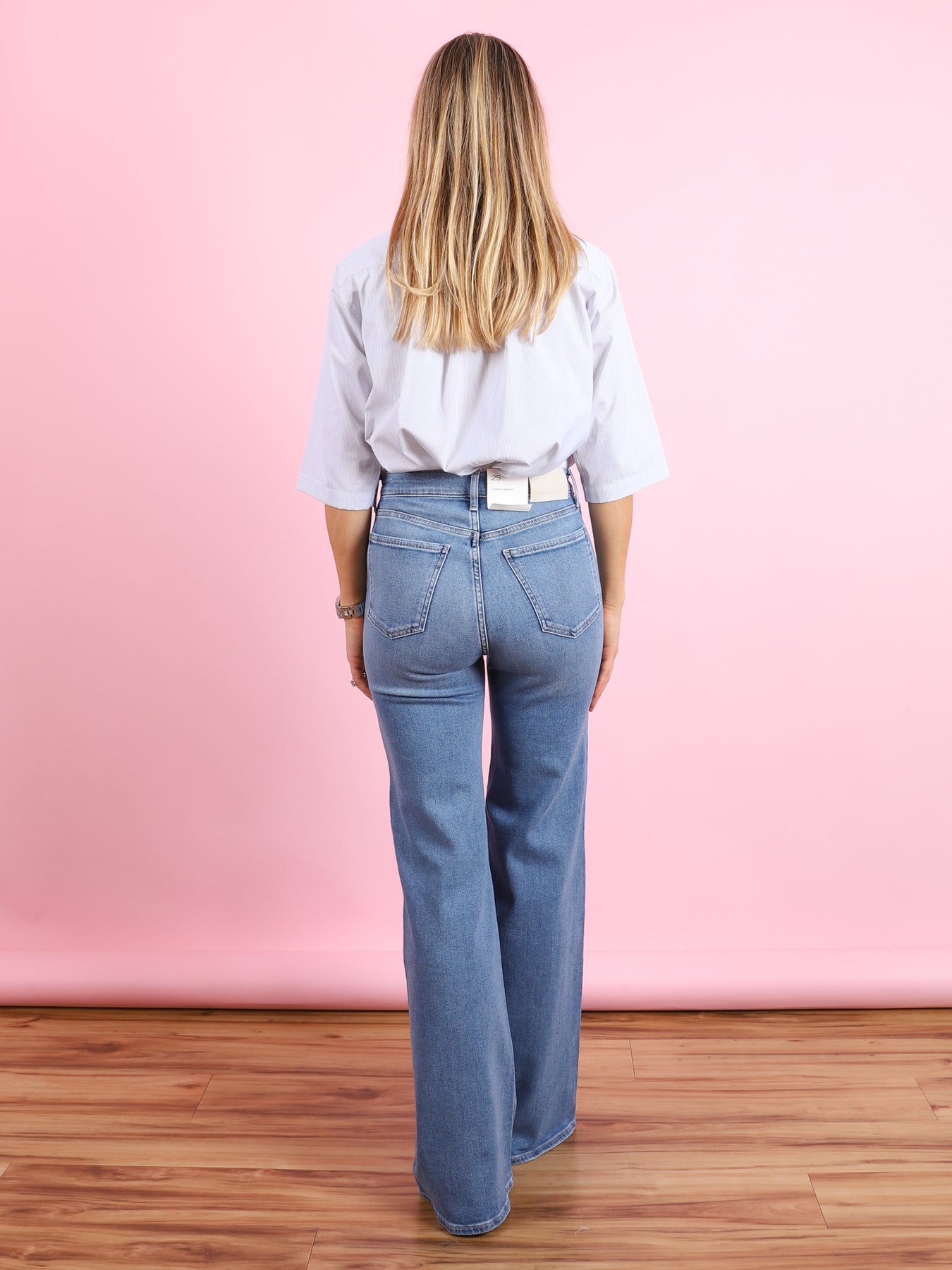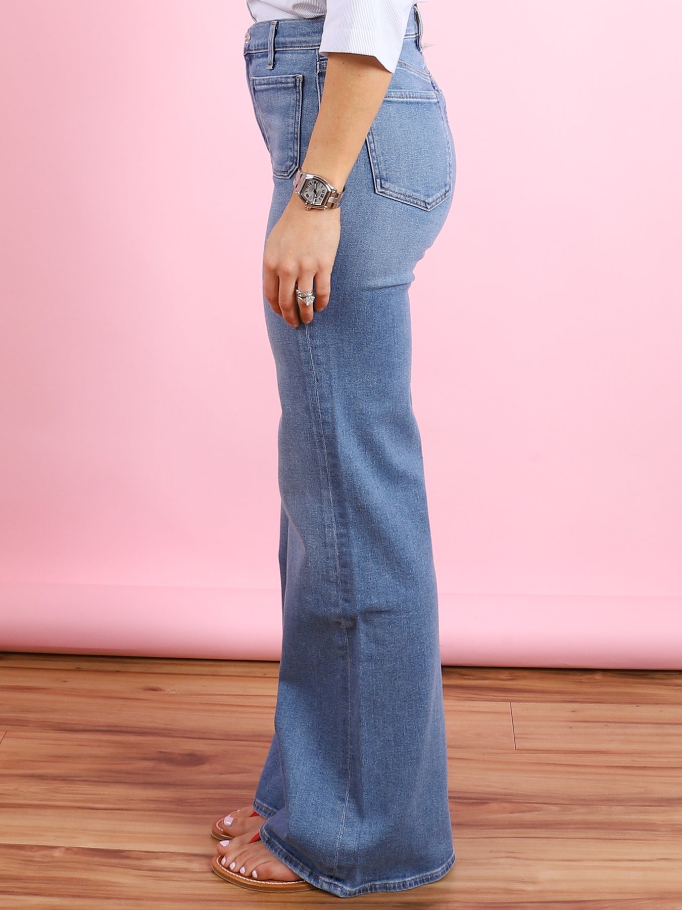 A high-rise flare designed to contour the waist with a clean, balanced silhouette. Finished with front patch pockets, it brings a subtle utilitarian touch to a timeless shape. Crafted from medium indigo comfort stretch archive denim, it offers a super-soft hand with all-day wearability. Effortlessly versatile, it pairs seamlessly with crisp shirting or fitted knits for a polished, modern look