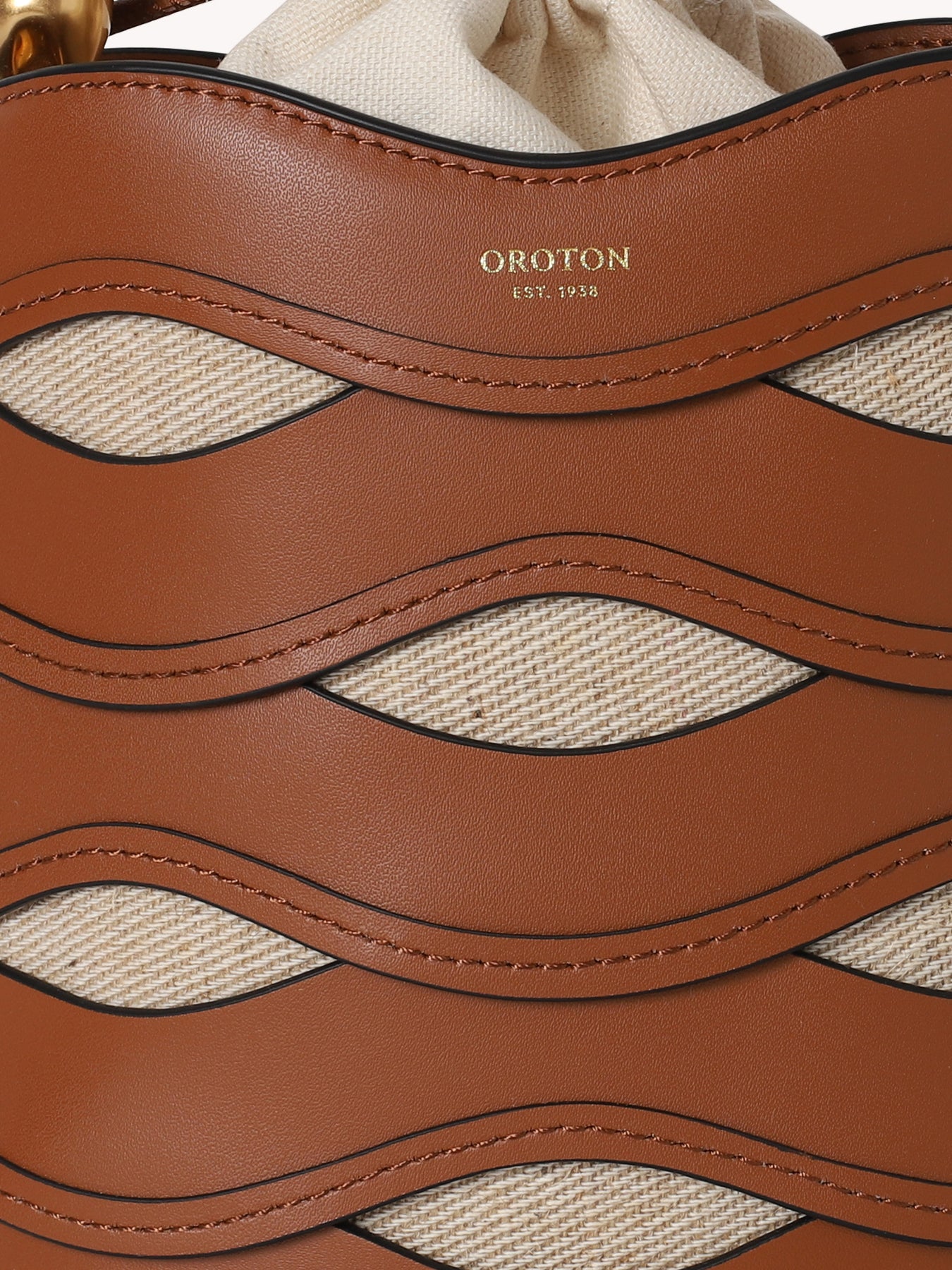 The Leigh Ric Rac Bucket Bag reimagines Oroton craftsmanship in a new shape, featuring interwoven leather and cotton canvas panels. A removable natural bamboo handle adds a refined touch, making it the ideal style for travel or warm-weather occasions.