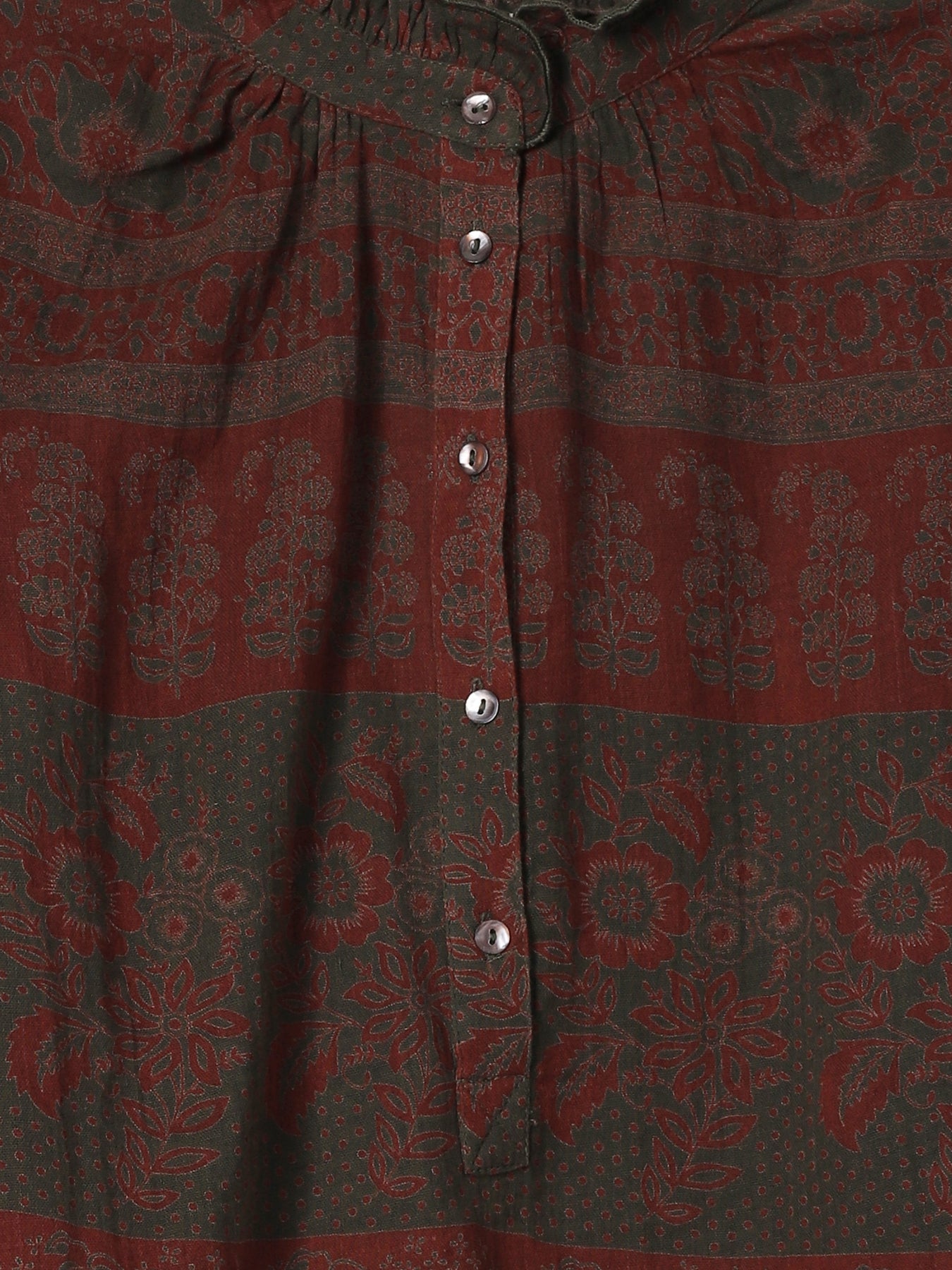 Cotton gauze blouse. Long sleeves. Small ruffled collar. Button opening.