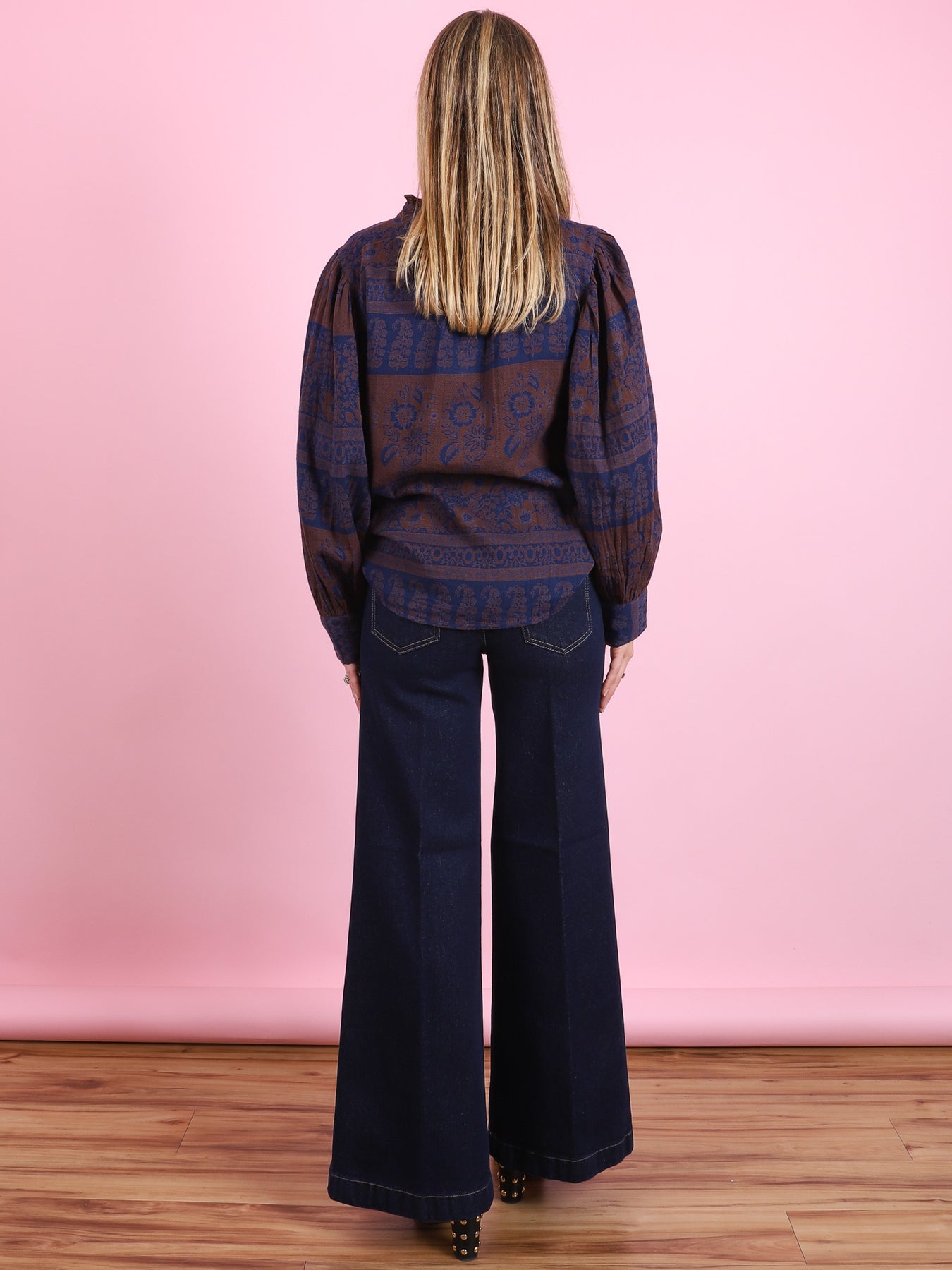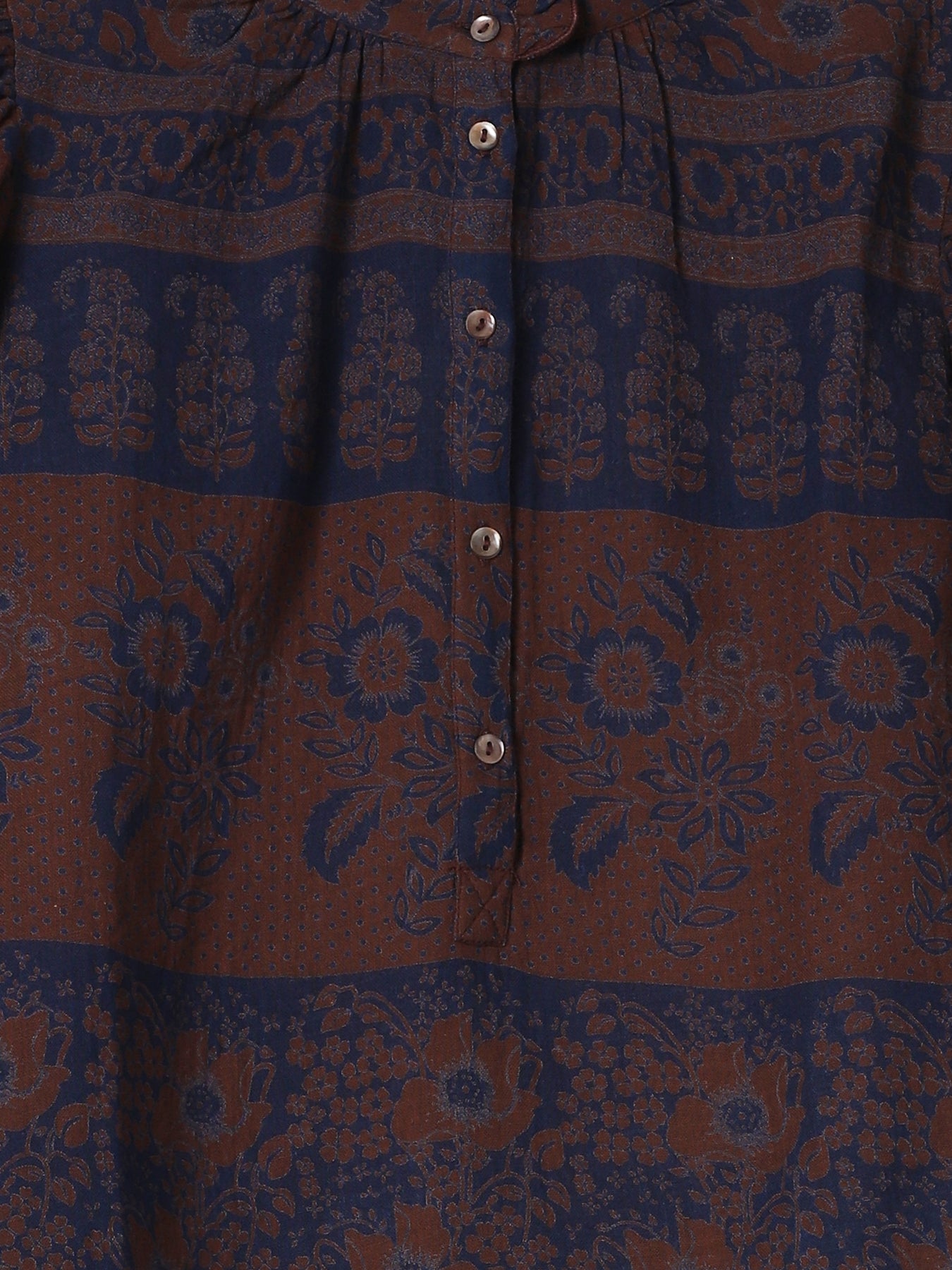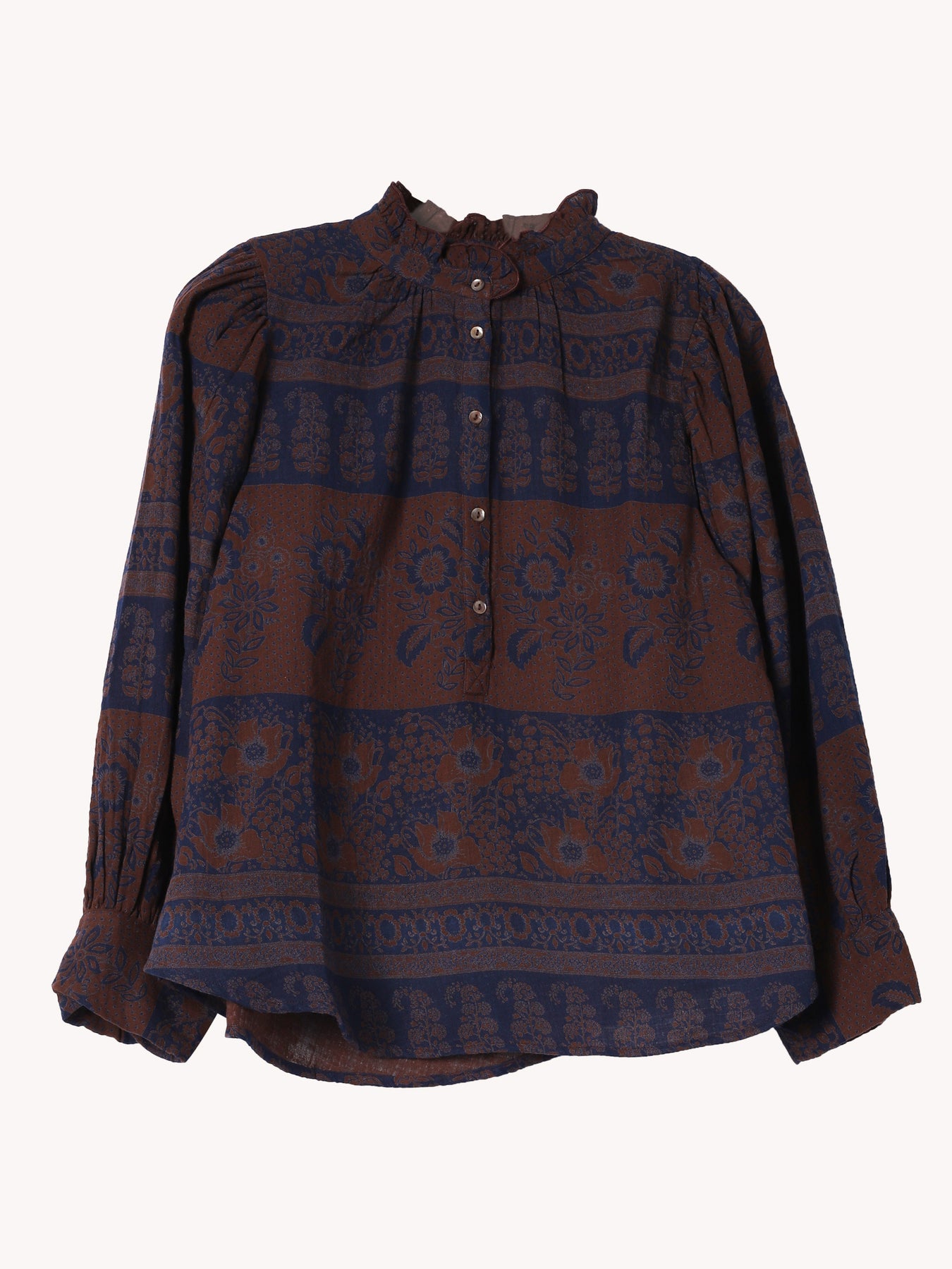 Cotton gauze blouse. Long sleeves. Small ruffled collar. Button opening.