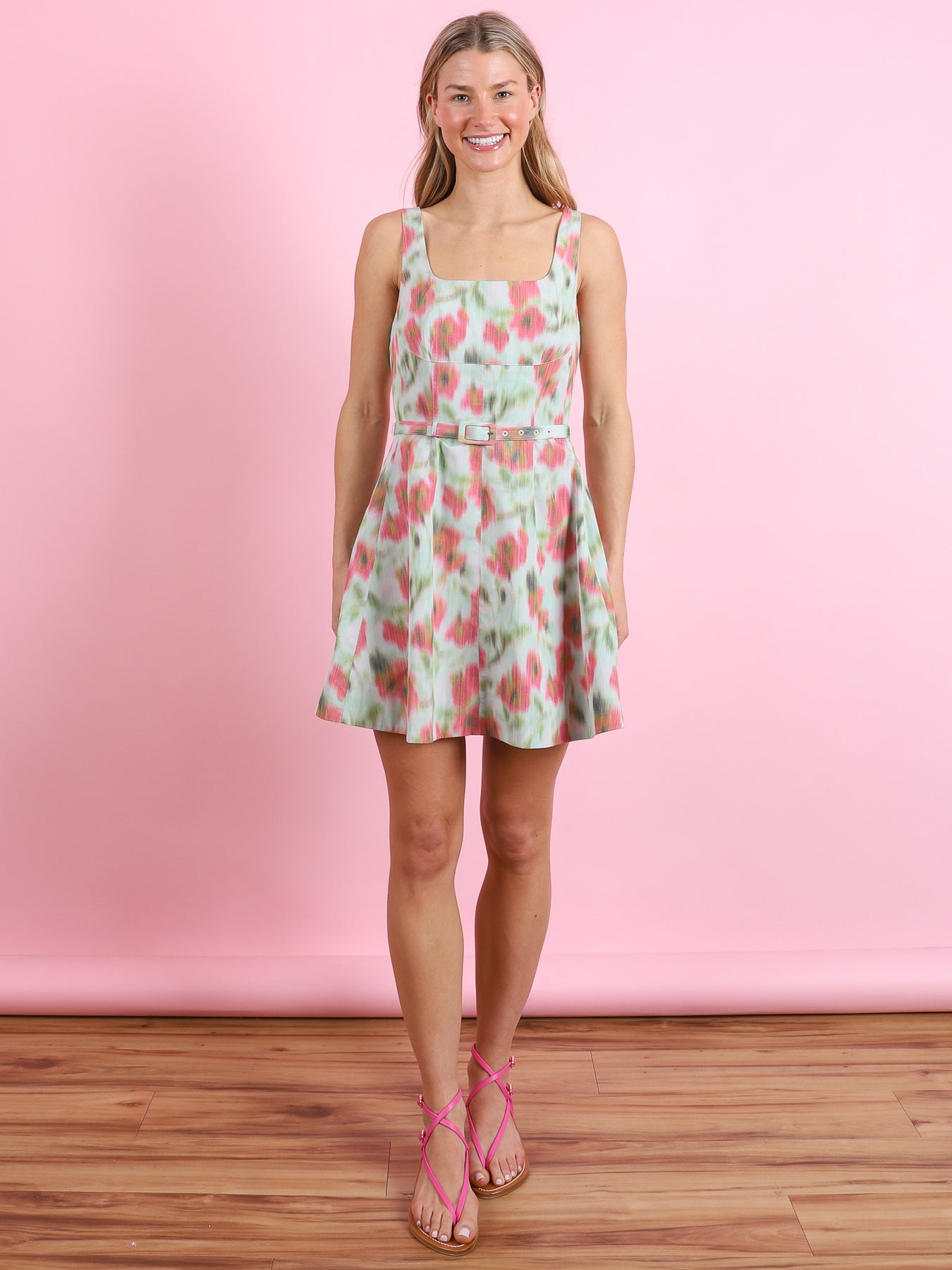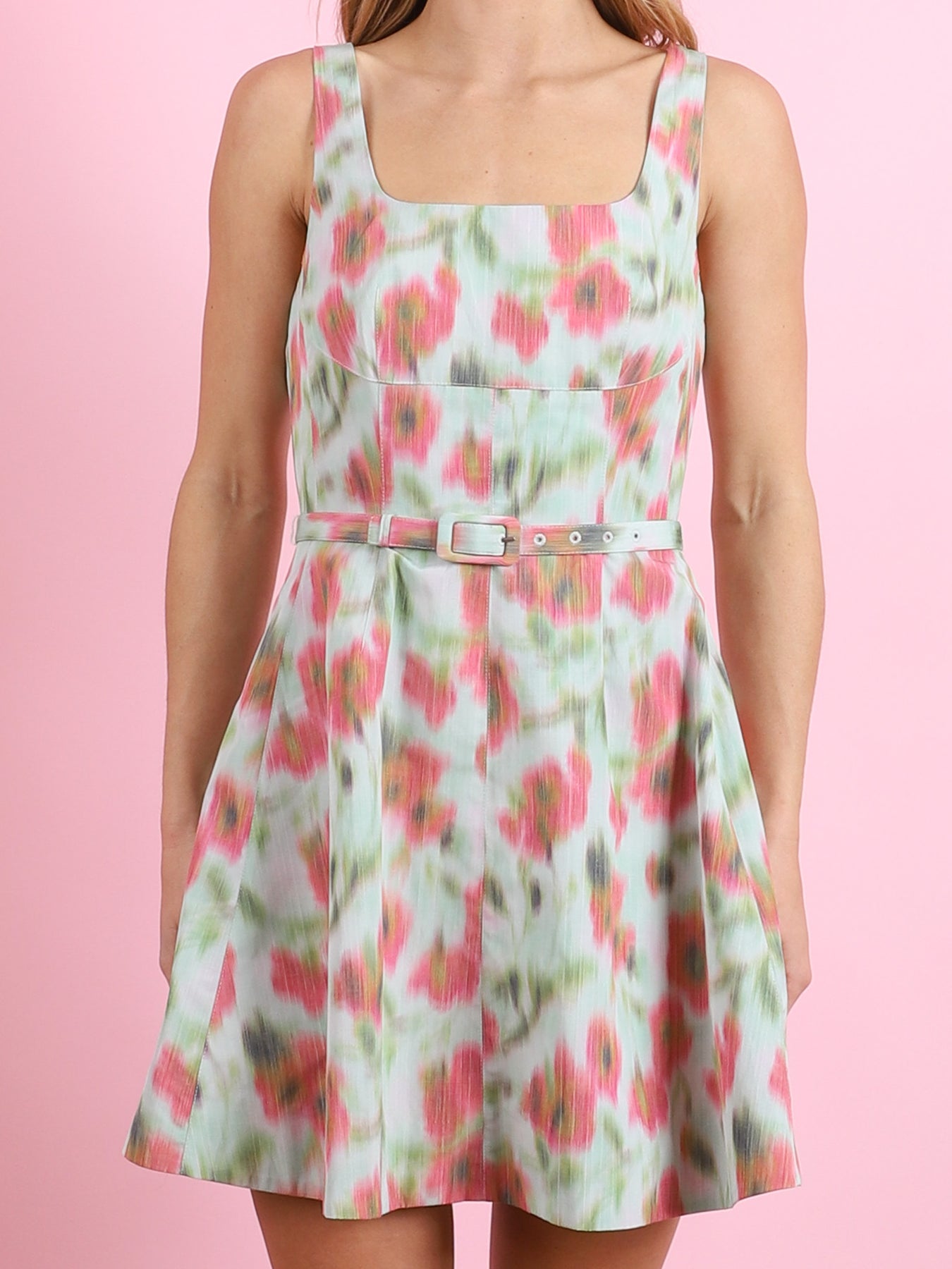 Designed in a floral printed taffeta, the Paige Dress is a fresh take on spring florals with an elevated silhouette with a feminine prep. Featuring a structured A-line silhouette, scoop neckline, and a thin belt to accentuate the waist, Paige is the perfect balance of playfulness and sophistication. Style with your favorite pair kitten heels for a fun soirée look.