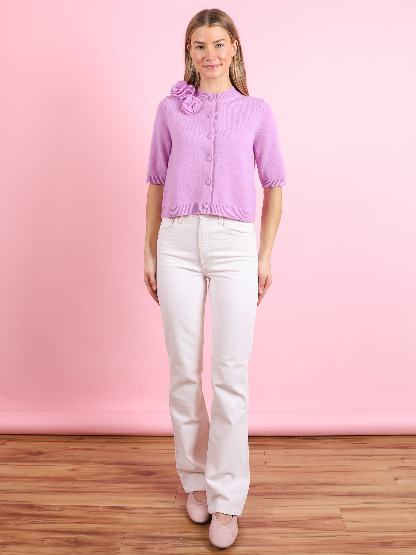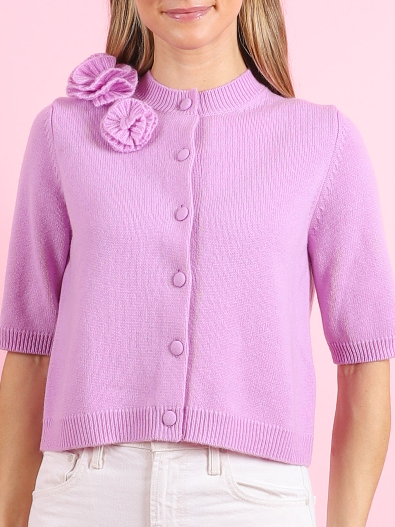 RD Cardigan with Appliqué Roses in Wisteria