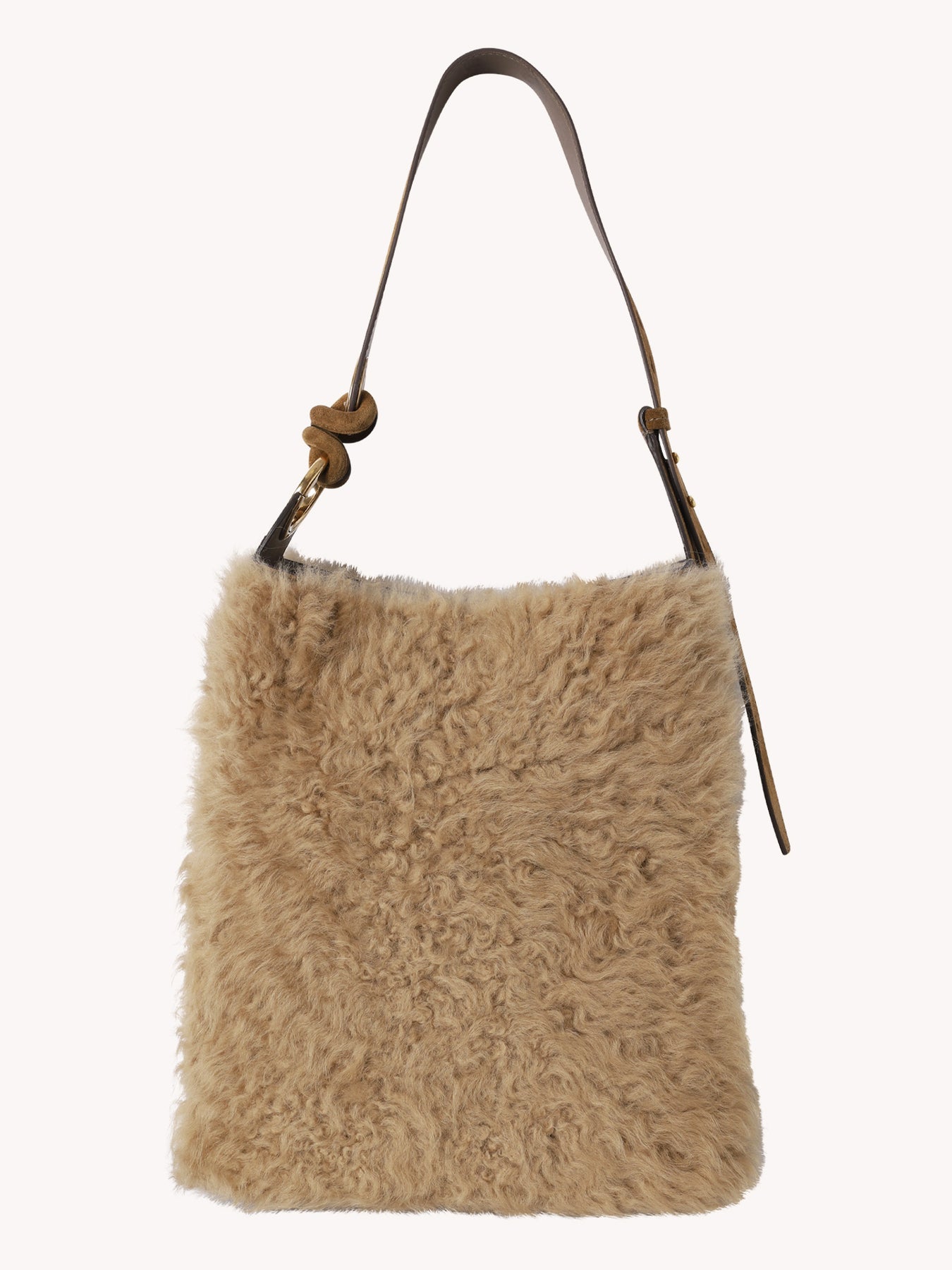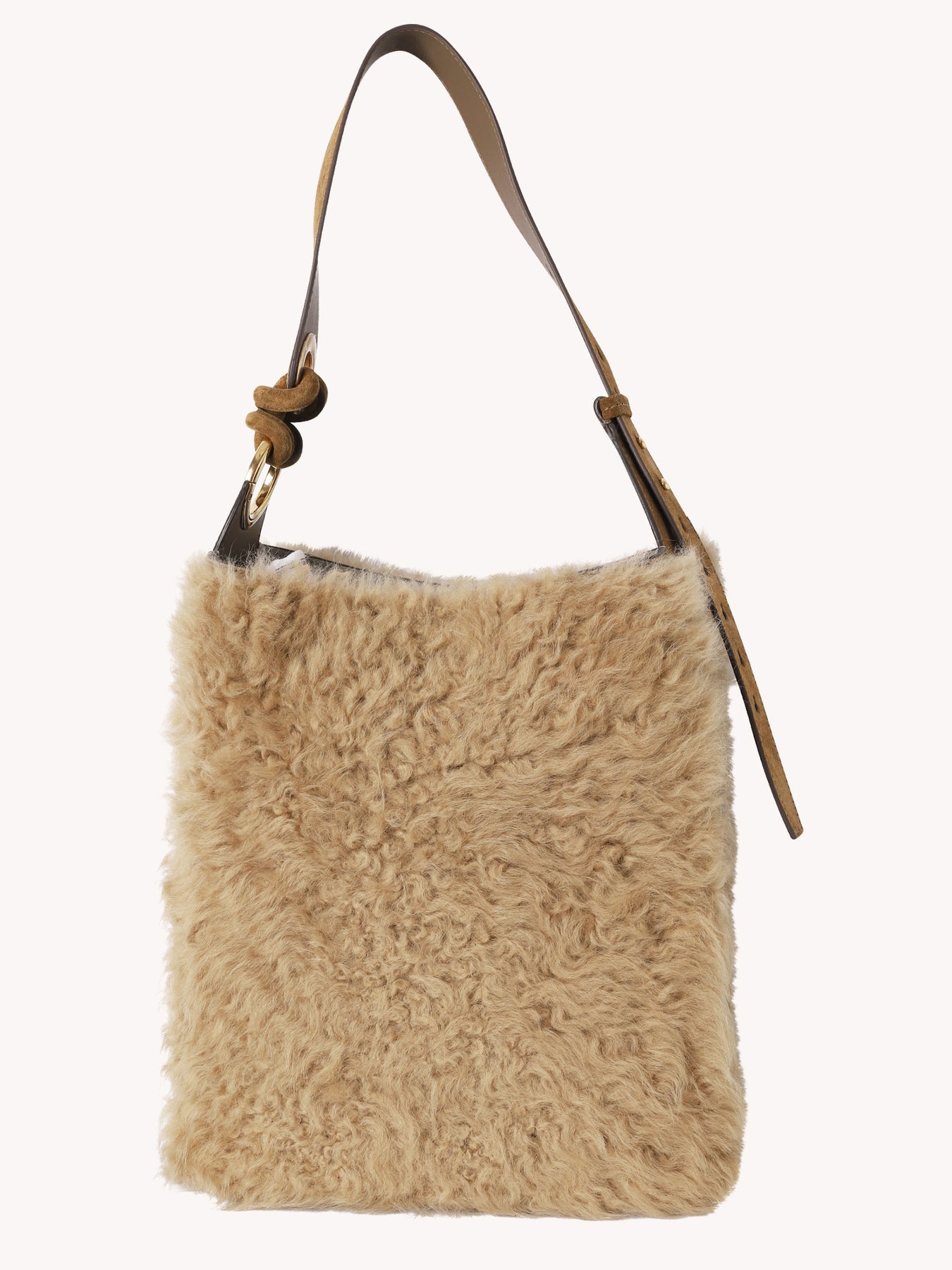 Ringo has been designed with a clean and simple exterior (we've even hidden the fastening inside the bag), allowing one key detail to shine: a chunky rouleaux knot threaded through an oversized, branded eyelet, the bag's distinguishing feature. Ringo is made from silky calf leather and shearling, with plenty of internal space for daily essentials, and an interior slip pocket. The strap is adjustable, so you can wear it over your shoulder or in the crook of your arm.