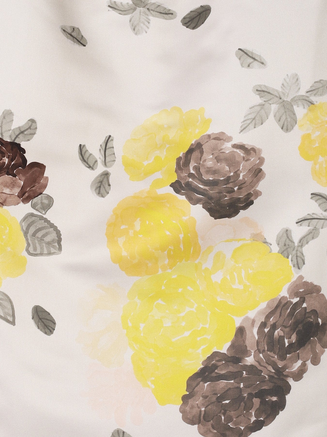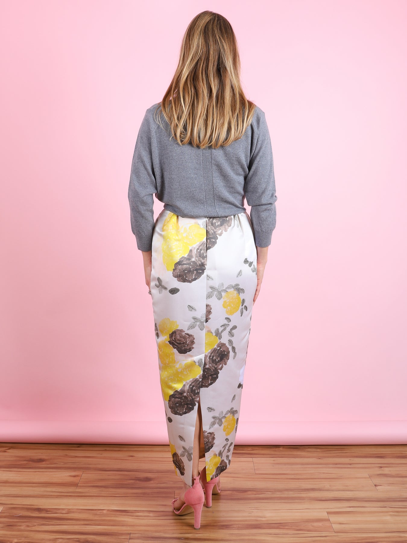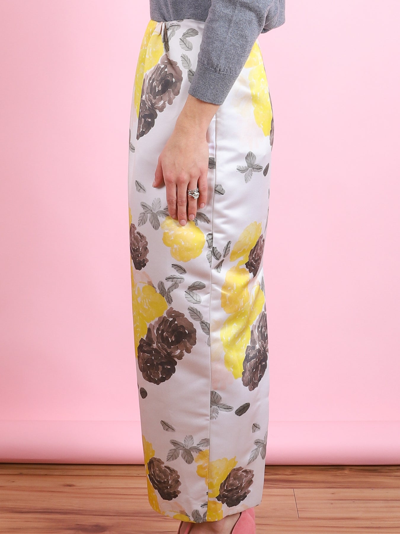 Crafted with Bernadette's in-house drawn Auscot Rose print in yellow and chocolate on vanilla, The Damian Skirt features a voluminous shape tapered elegantly at the hem. The fabric has a fluid silk-satin feel, adding fluidity to the skirt.