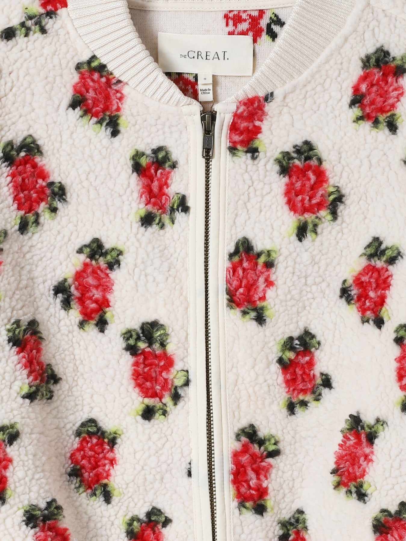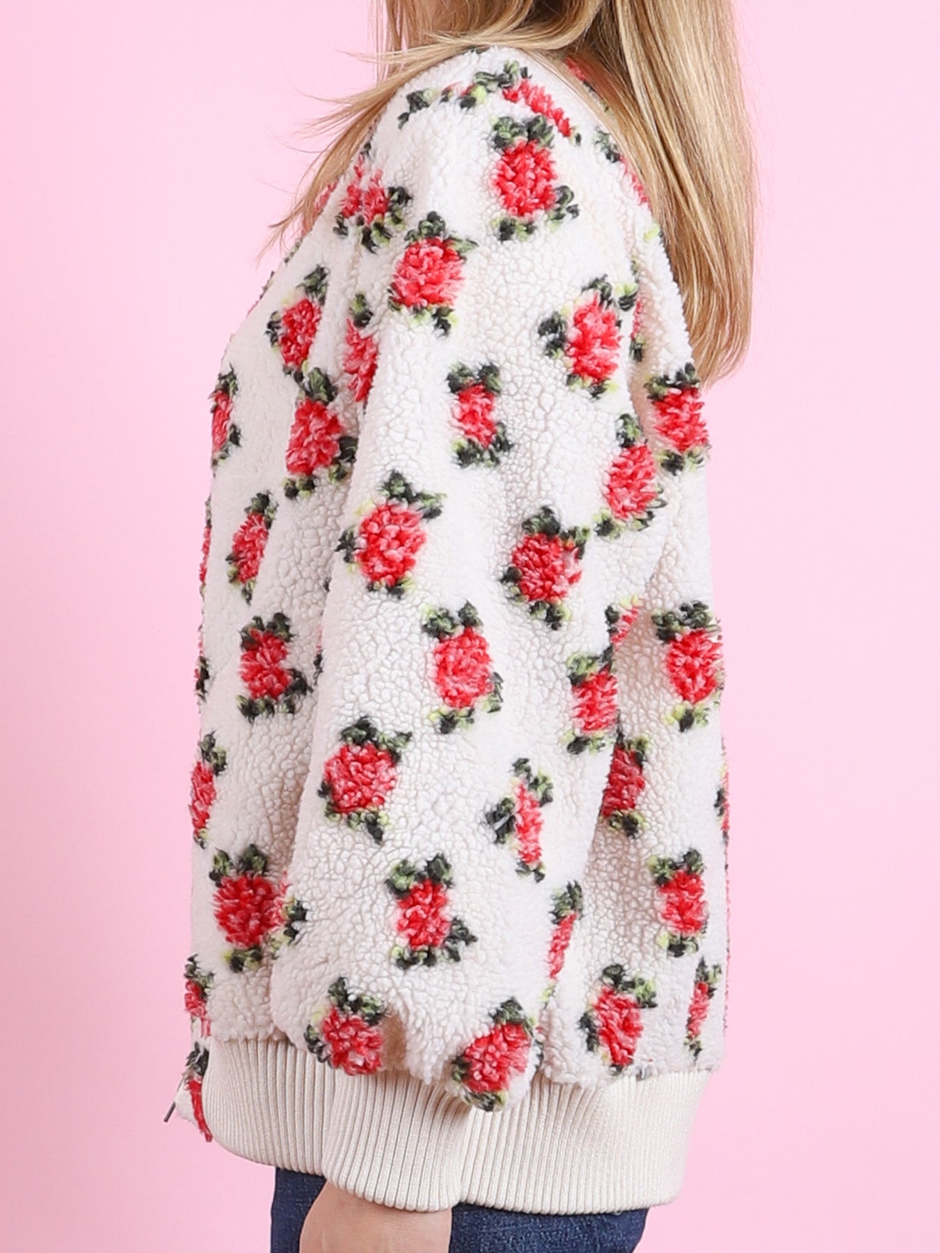100% polyester faux shearling, 96% rayon, 4% elastane trim.